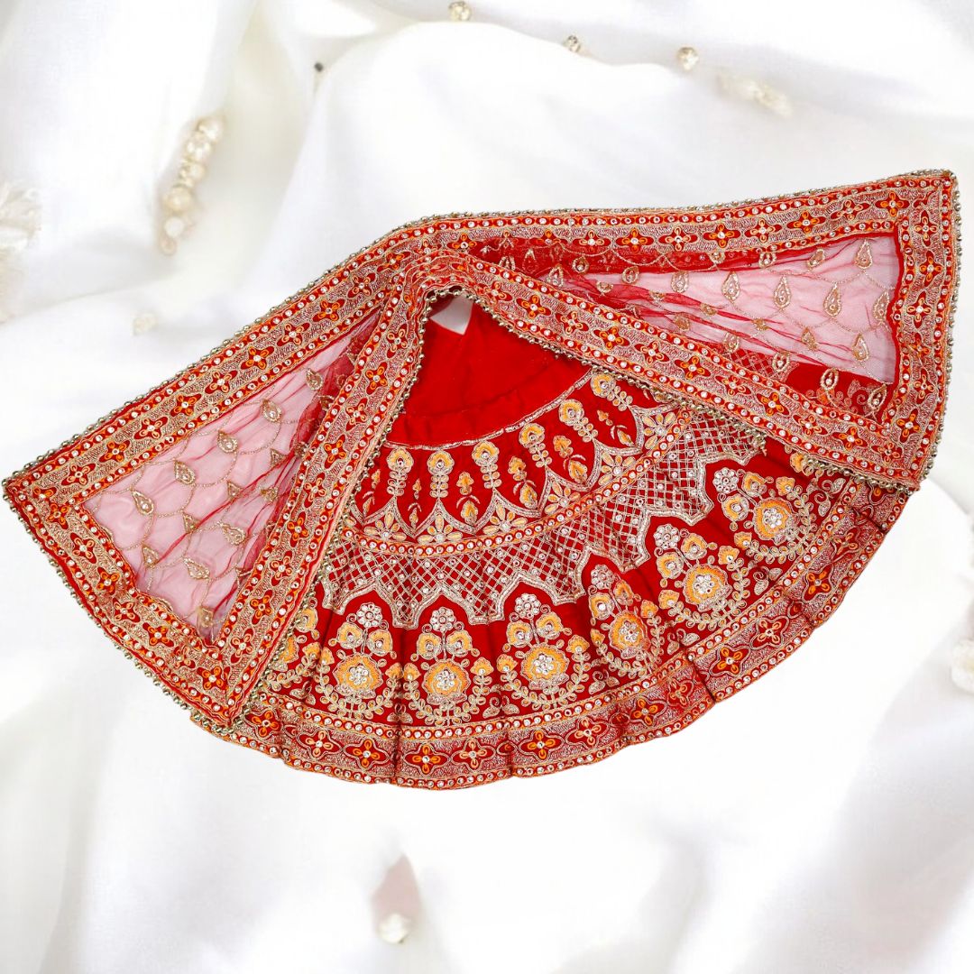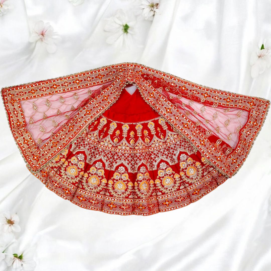 Adorn your beloved Matarani with this Premium Bridal Style Lehenga Choli Set, designed to bring a divine bridal charm to your temple. With its royal detailing and devotional aura, this masterpiece is crafted to make your celebrations truly unforgettable.