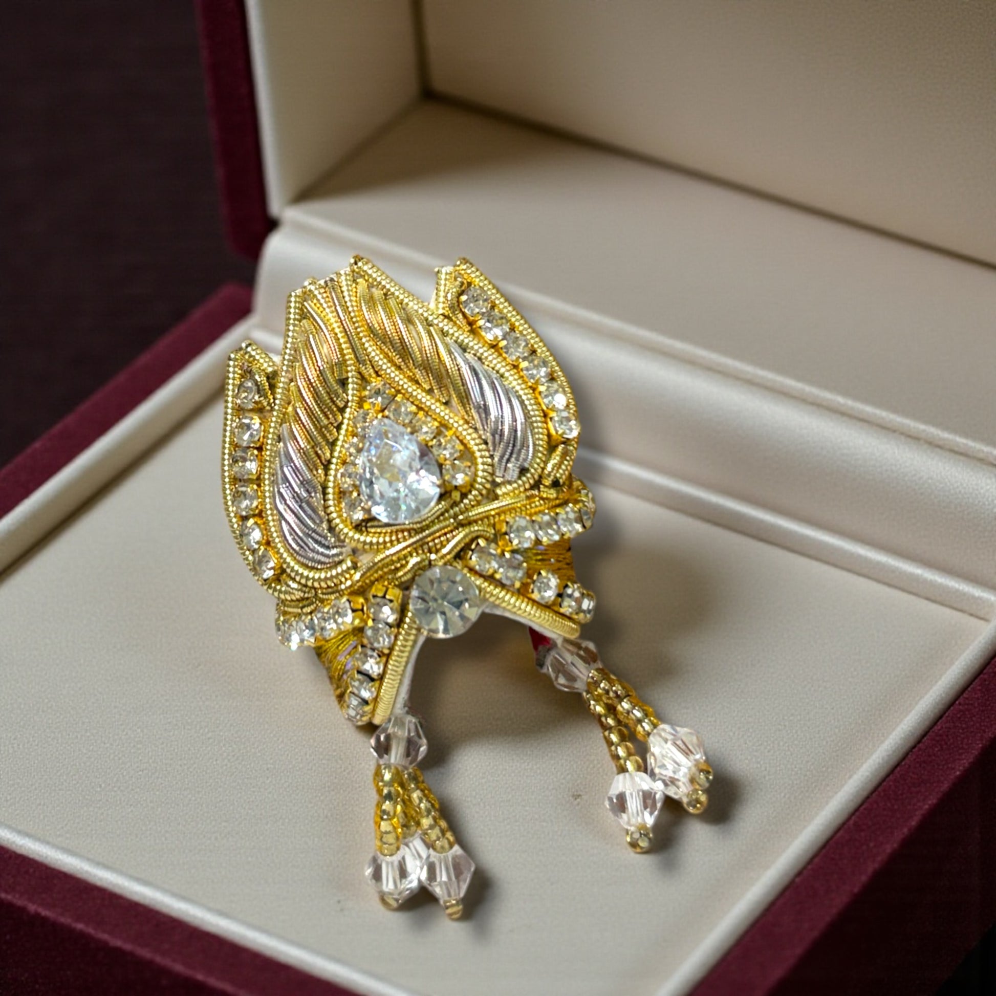 Diamond-Cut Centerpiece: A large, precision-cut teardrop crystal sits at the heart of the mukut, acting as a powerful focal point of spiritual light.