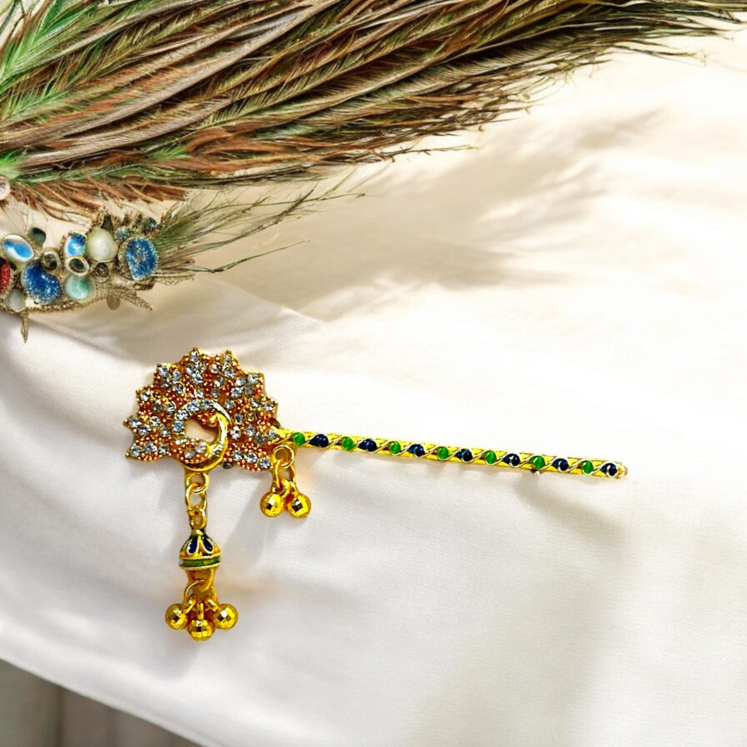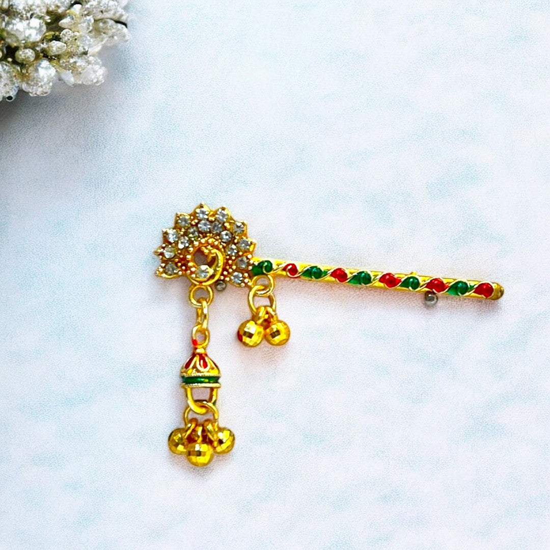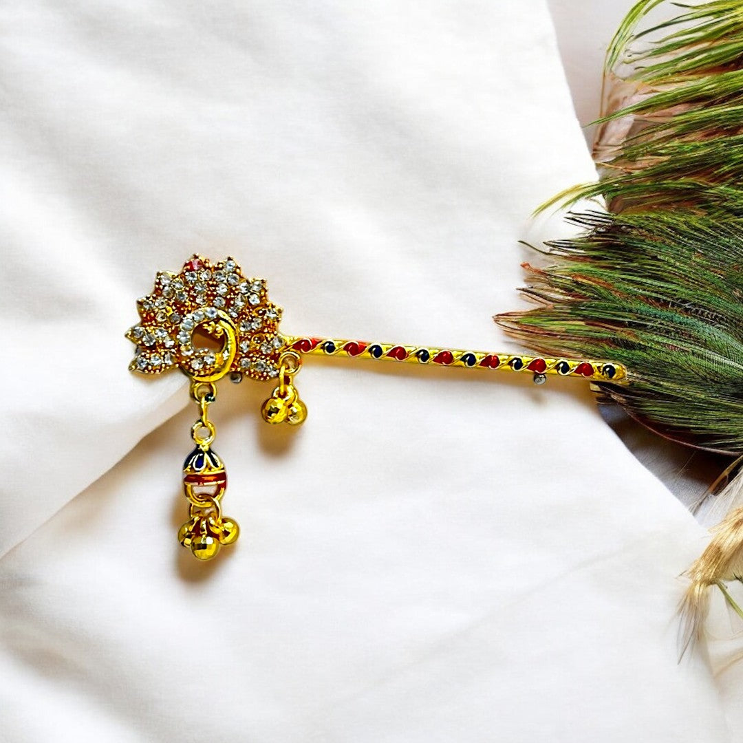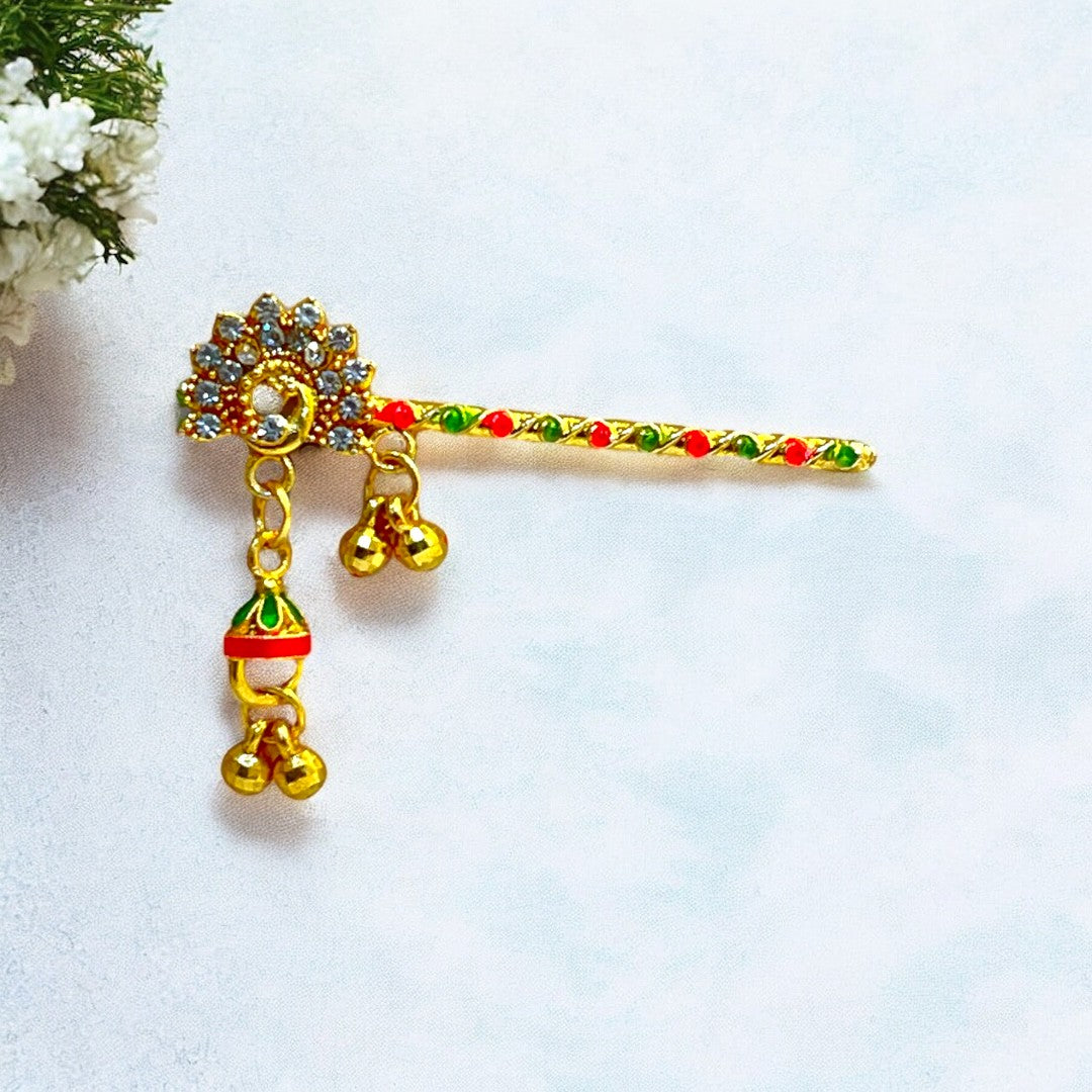Adorn your Thakur Ji with this exquisite handcrafted Bansi, designed to reflect the playful and divine charm of Lord Krishna. Featuring elegant red and green thread detailing, a glossy golden finish, and a vibrant red droplet charm, this Bansi adds a festive and devotional touch to your deity’s look. The intricate peacock-inspired design on the handle enhances its traditional beauty.