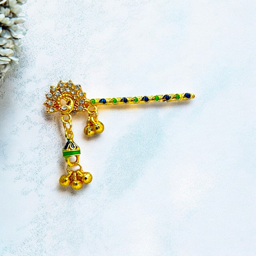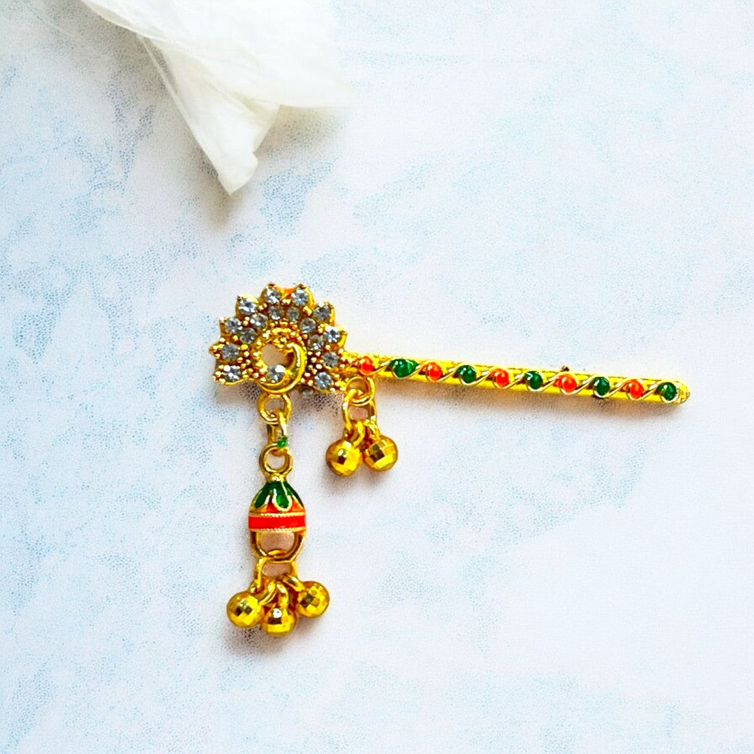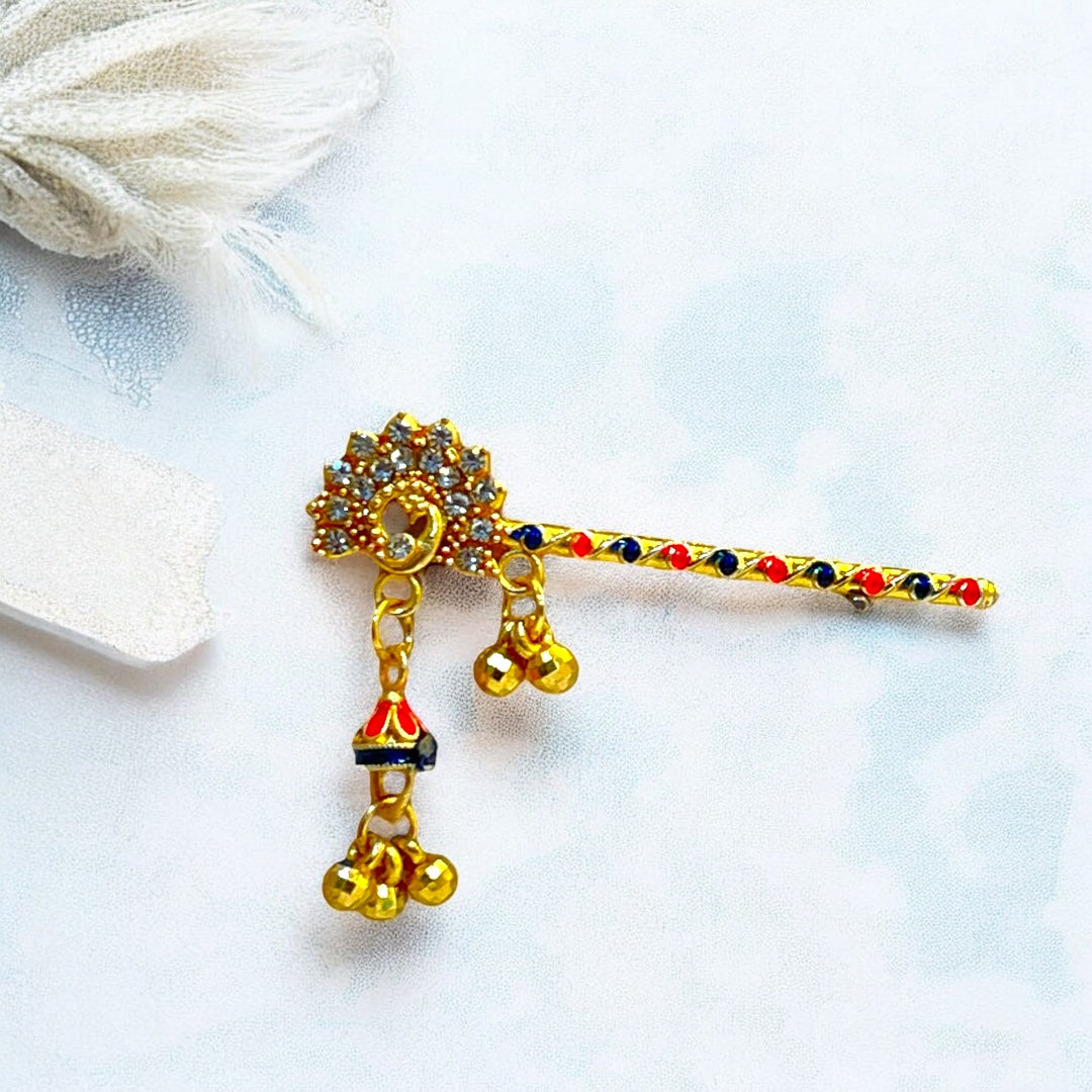 Adorn your Thakur Ji with this exquisite handcrafted Bansi, designed to reflect the playful and divine charm of Lord Krishna. Featuring elegant red and green thread detailing, a glossy golden finish, and a vibrant red droplet charm, this Bansi adds a festive and devotional touch to your deity’s look. The intricate peacock-inspired design on the handle enhances its traditional beauty.