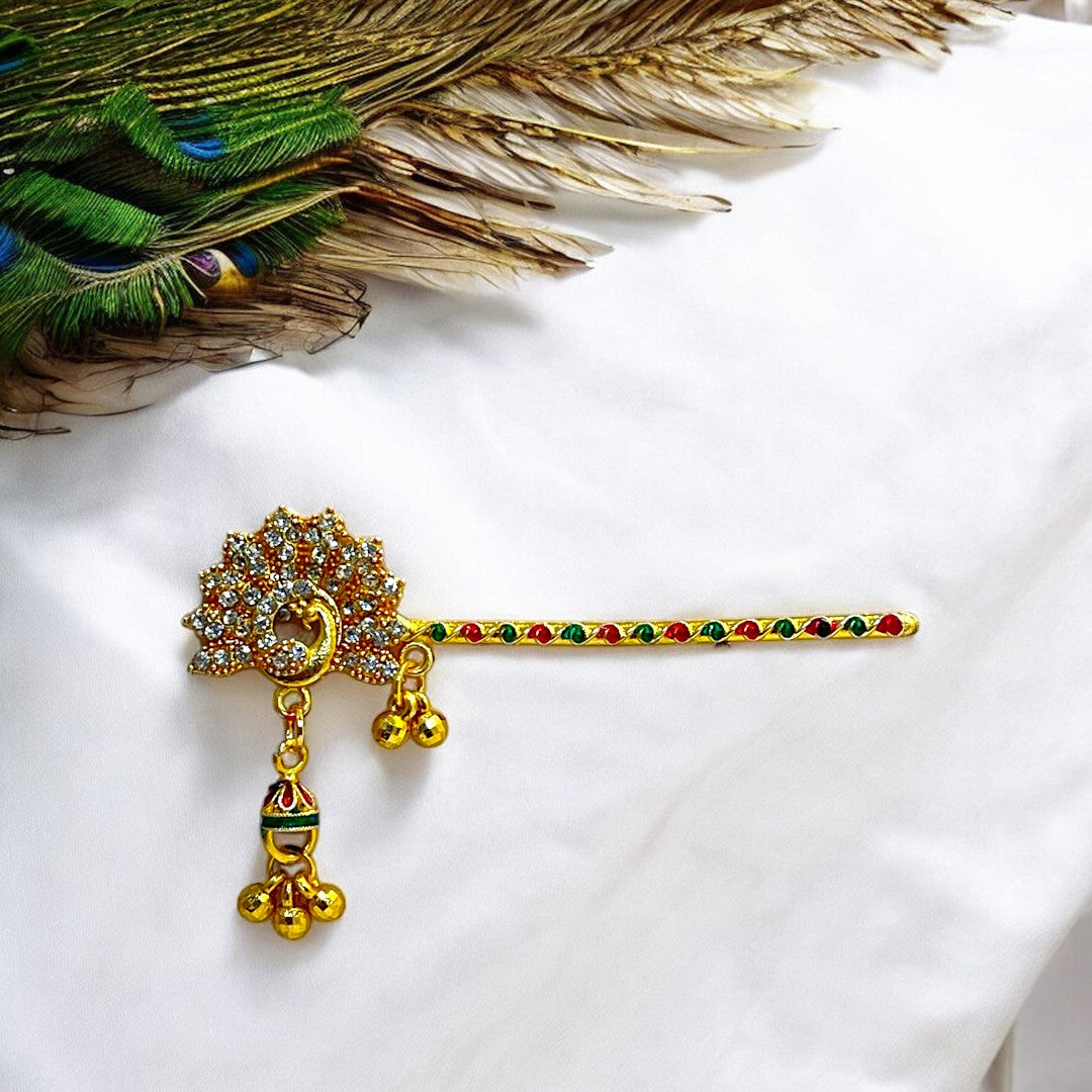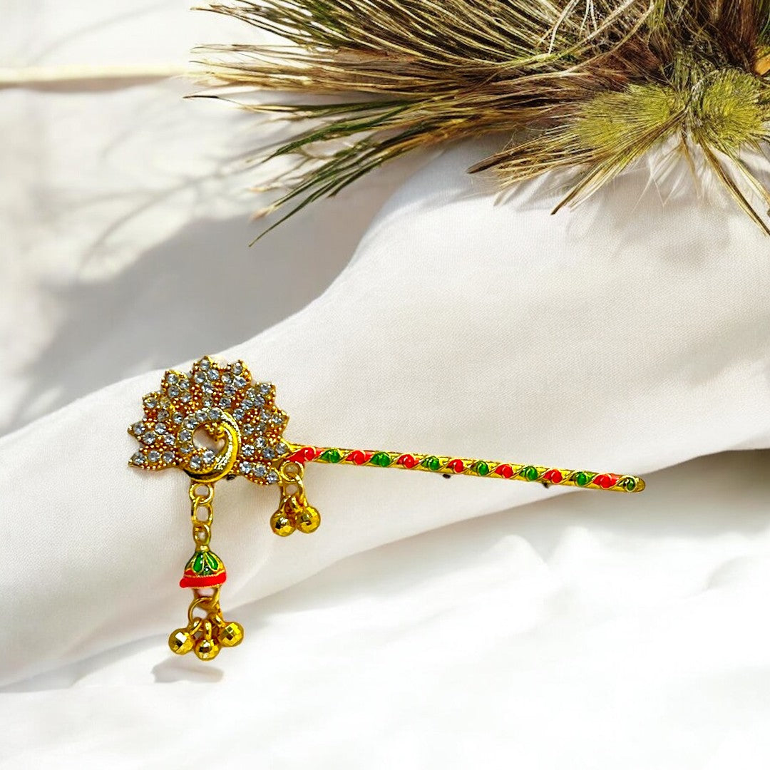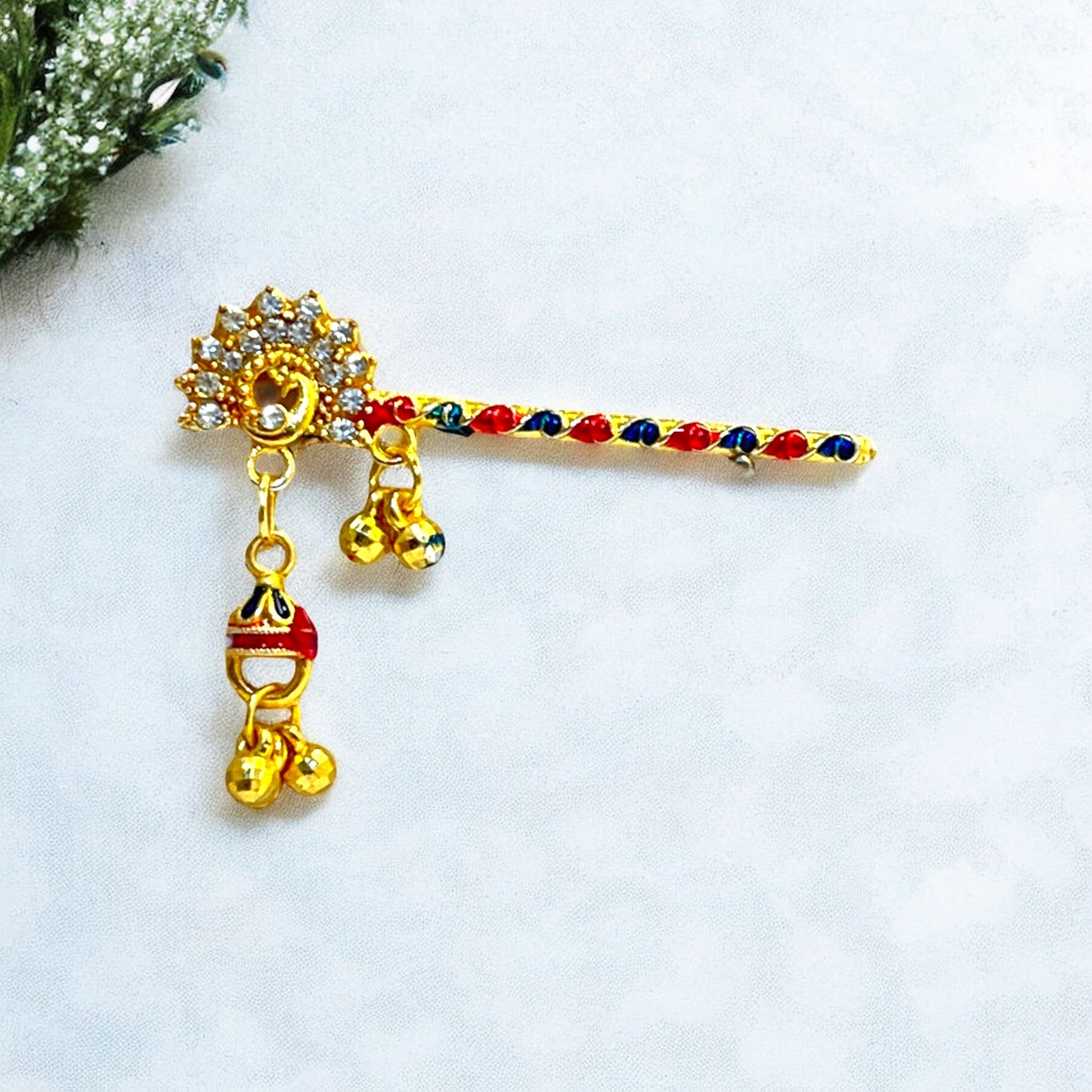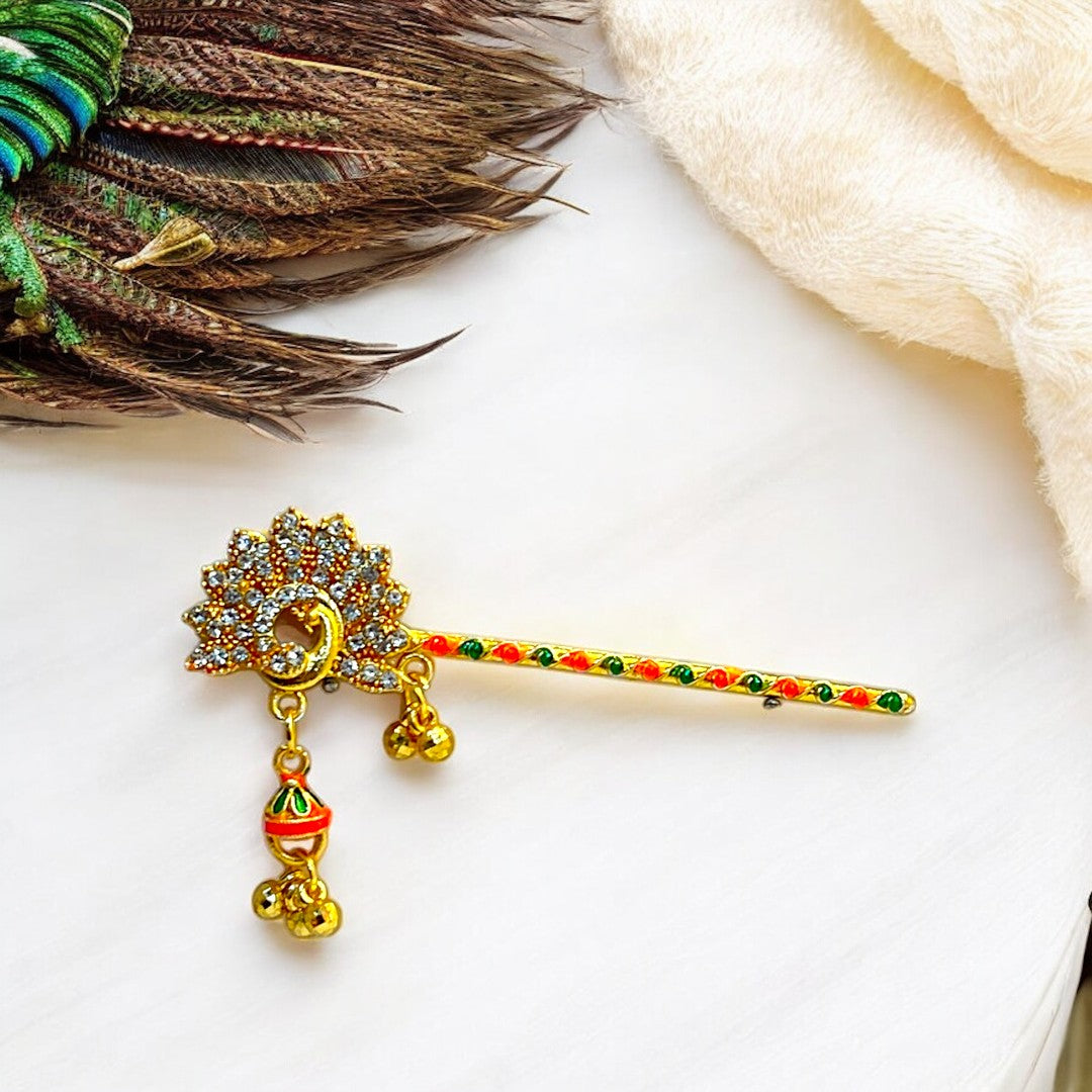 Adorn your Thakur Ji with this exquisite handcrafted Bansi, designed to reflect the playful and divine charm of Lord Krishna. Featuring elegant red and green thread detailing, a glossy golden finish, and a vibrant red droplet charm, this Bansi adds a festive and devotional touch to your deity’s look. The intricate peacock-inspired design on the handle enhances its traditional beauty.