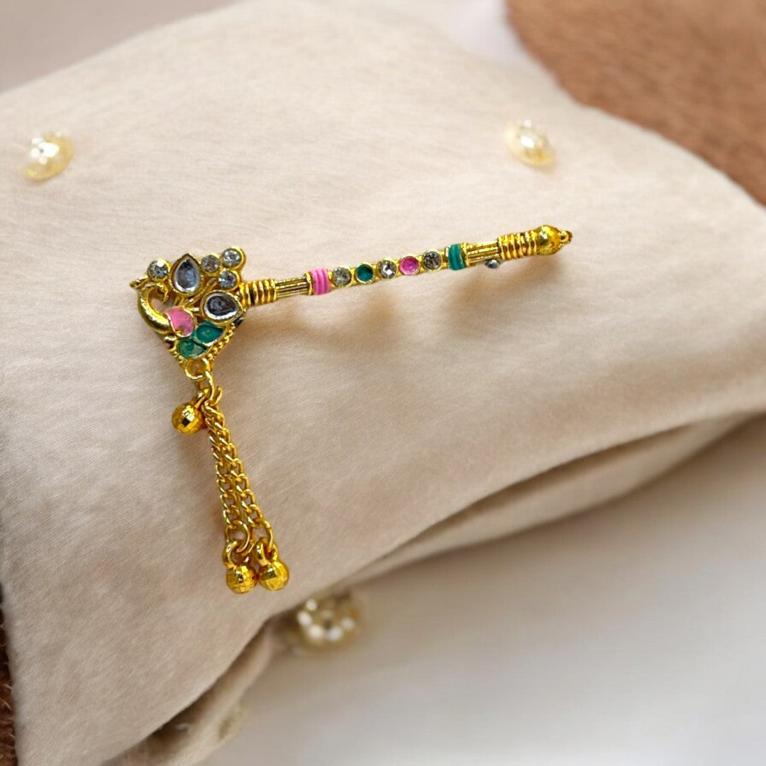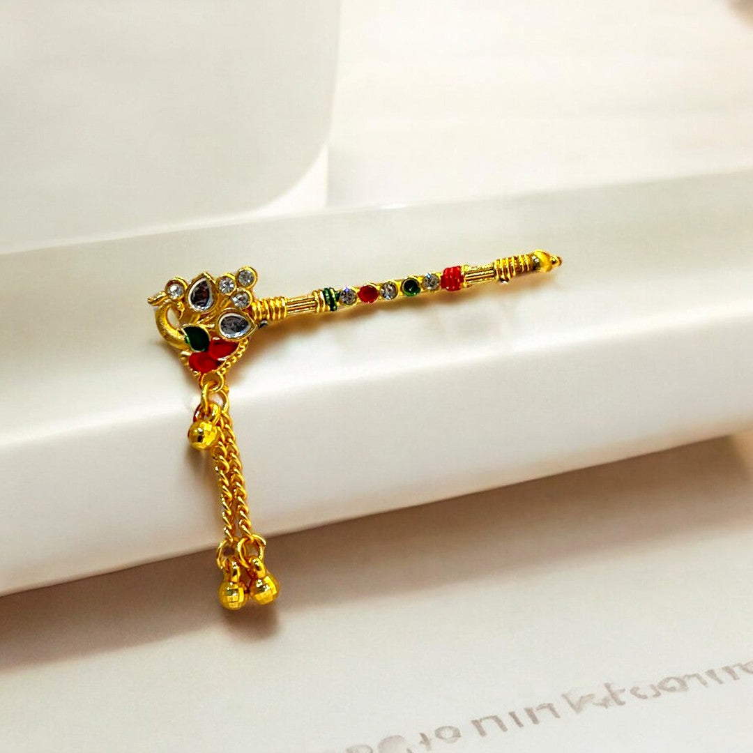 Adorn your Thakur Ji with this exquisite handcrafted Bansi, designed to reflect the playful and divine charm of Lord Krishna. Featuring elegant red and green thread detailing, a glossy golden finish, and a vibrant red droplet charm, this Bansi adds a festive and devotional touch to your deity’s look. The intricate peacock-inspired design on the handle enhances its traditional beauty.