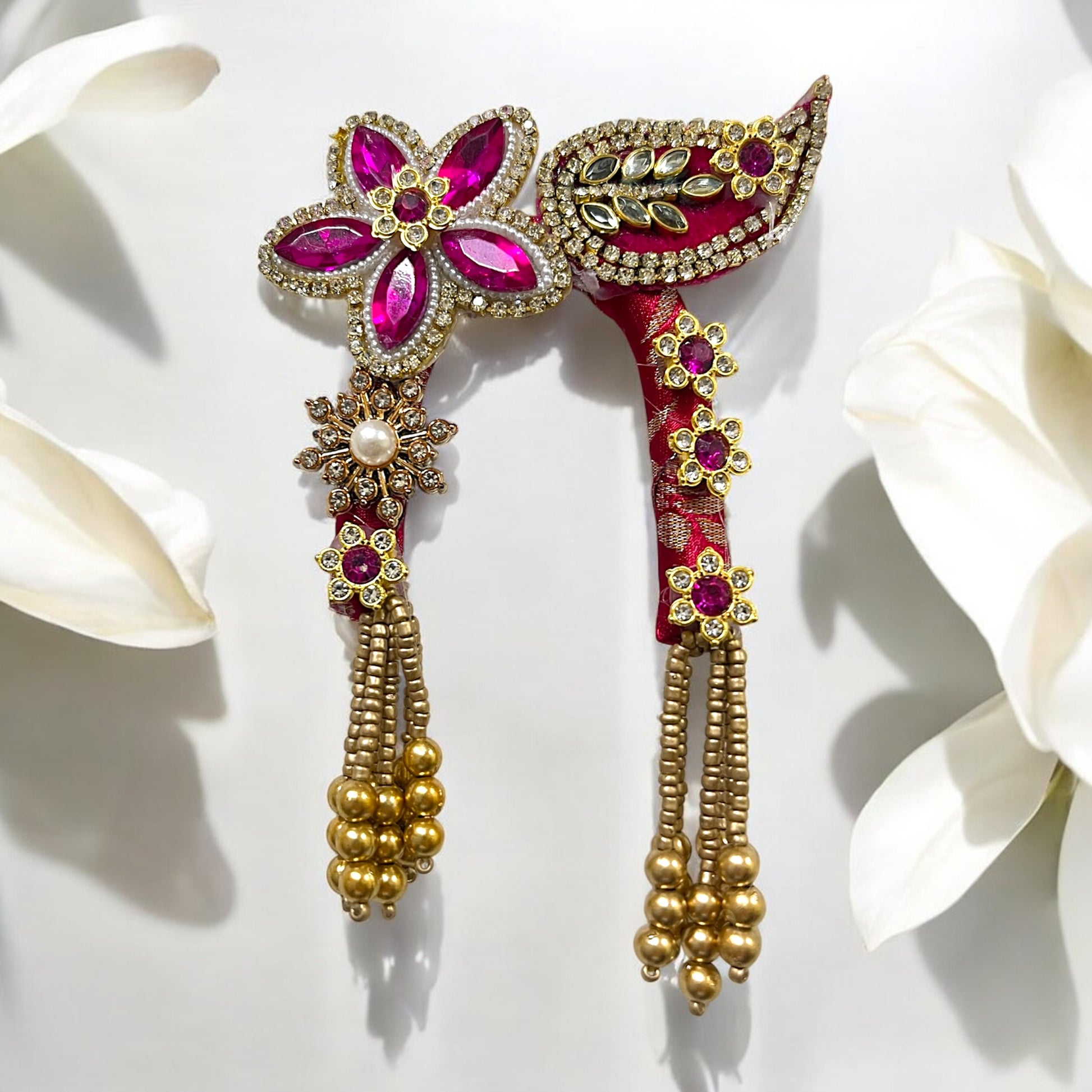 Elegant Tassel Drop: Finished with gold-toned bead strings and polished spheres that add a graceful sway to the deity’s Shringar.