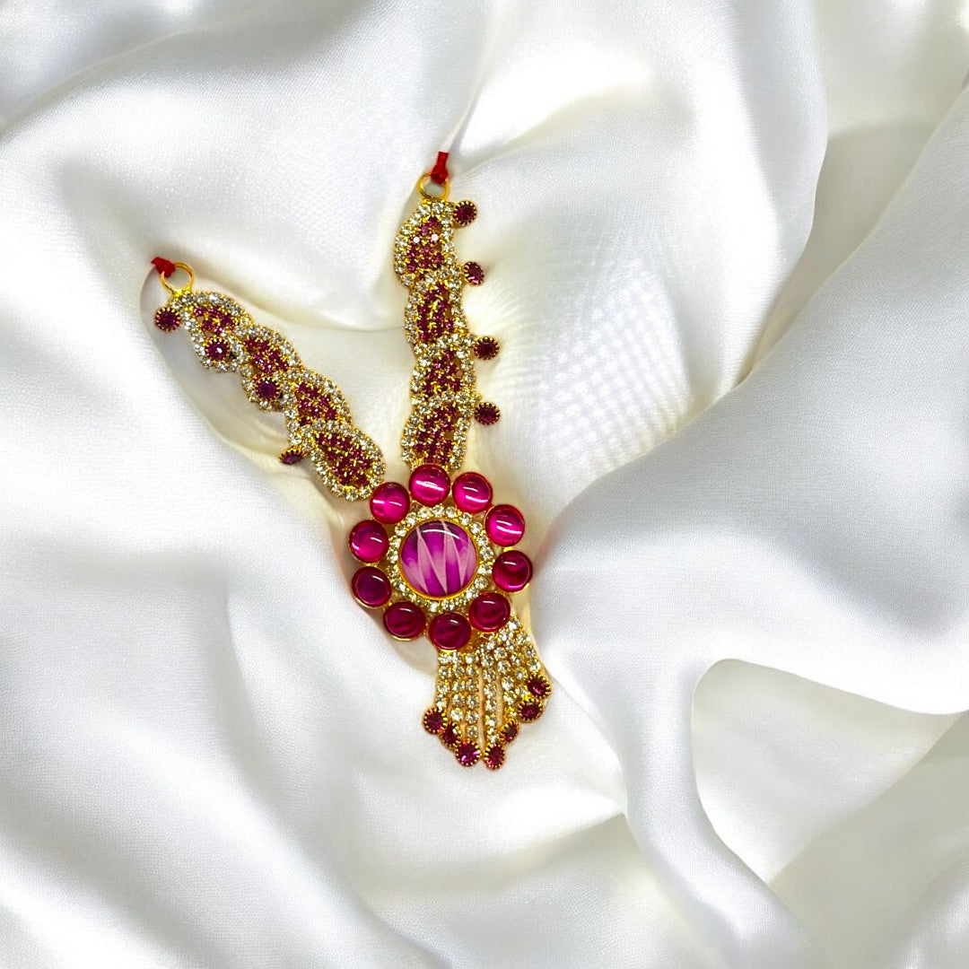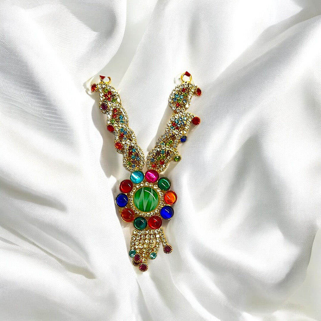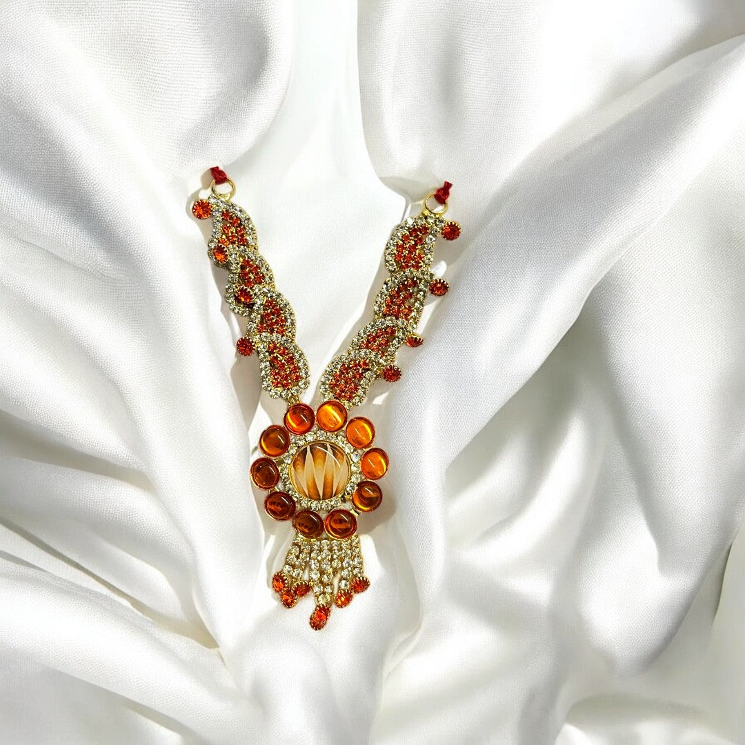 Bring home the blessings of divine elegance with this exquisitely crafted Zerkin Haar, made especially for standing idols like Radha Krishna, Mata Rani, and sacred Murtis. Hand-embellished with rich ruby-toned stones and shimmering zerkin work, this haar is more than just an ornament – it’s an offering of love, devotion, and royalty.