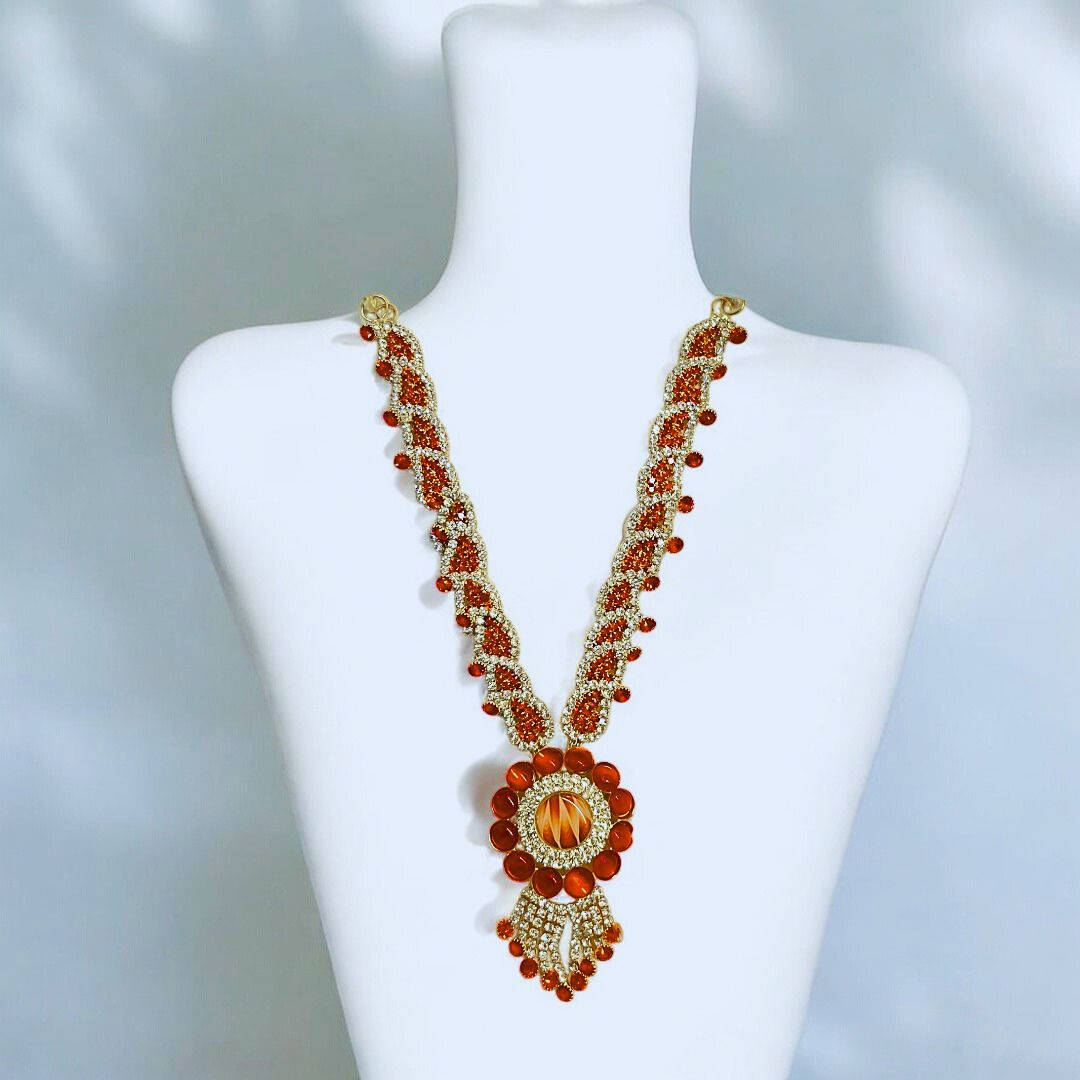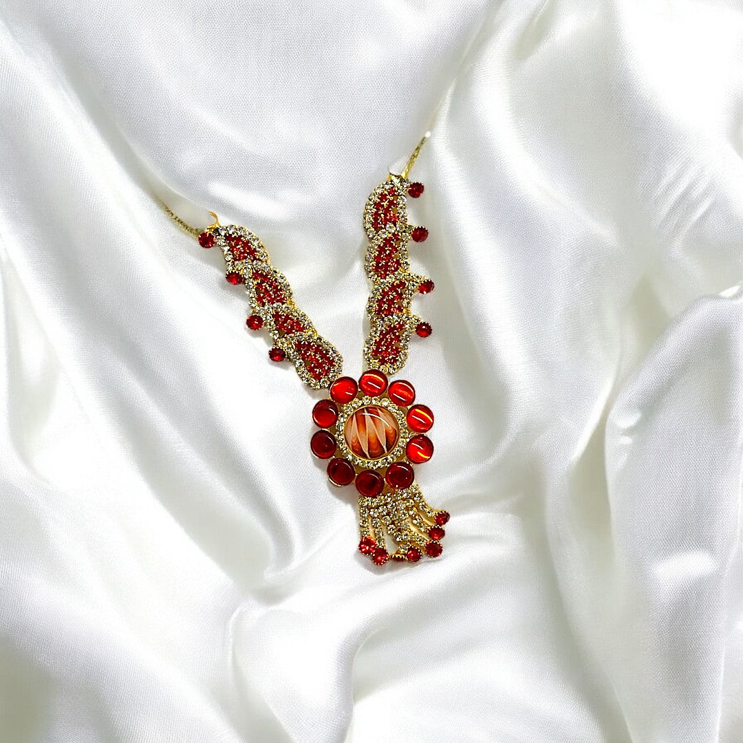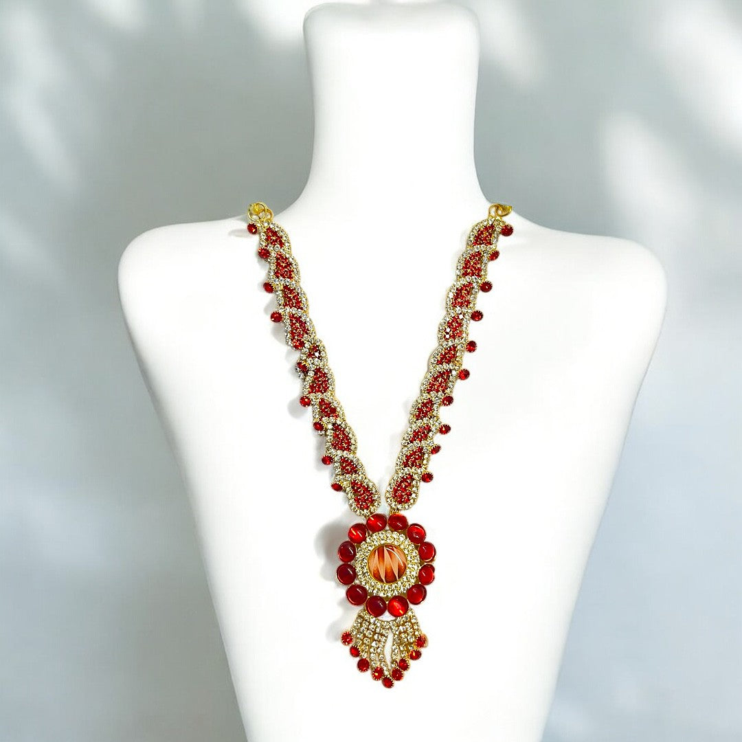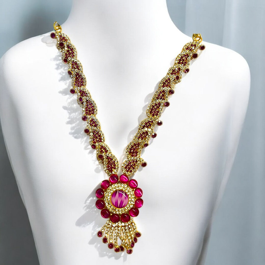Bring home the blessings of divine elegance with this exquisitely crafted Zerkin Haar, made especially for standing idols like Radha Krishna, Mata Rani, and sacred Murtis. Hand-embellished with rich ruby-toned stones and shimmering zerkin work, this haar is more than just an ornament – it’s an offering of love, devotion, and royalty.