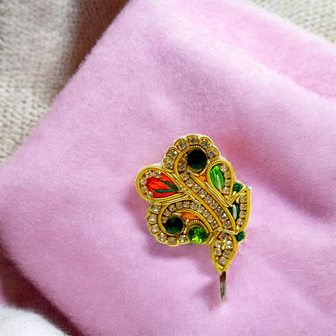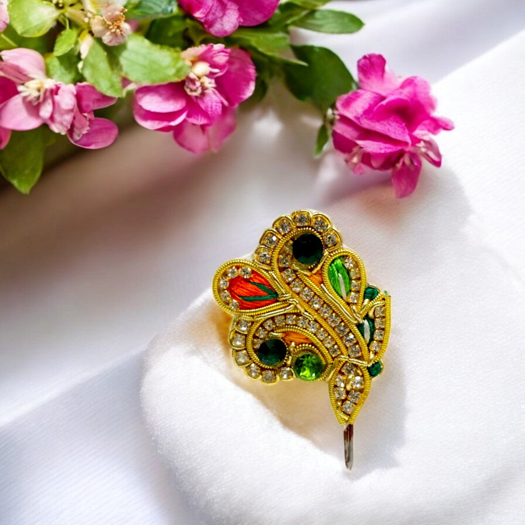 - Divine Design: This piece features a traditional peacock feather motif and radiant stones, symbolizing Lord Krishna's eternal charm.