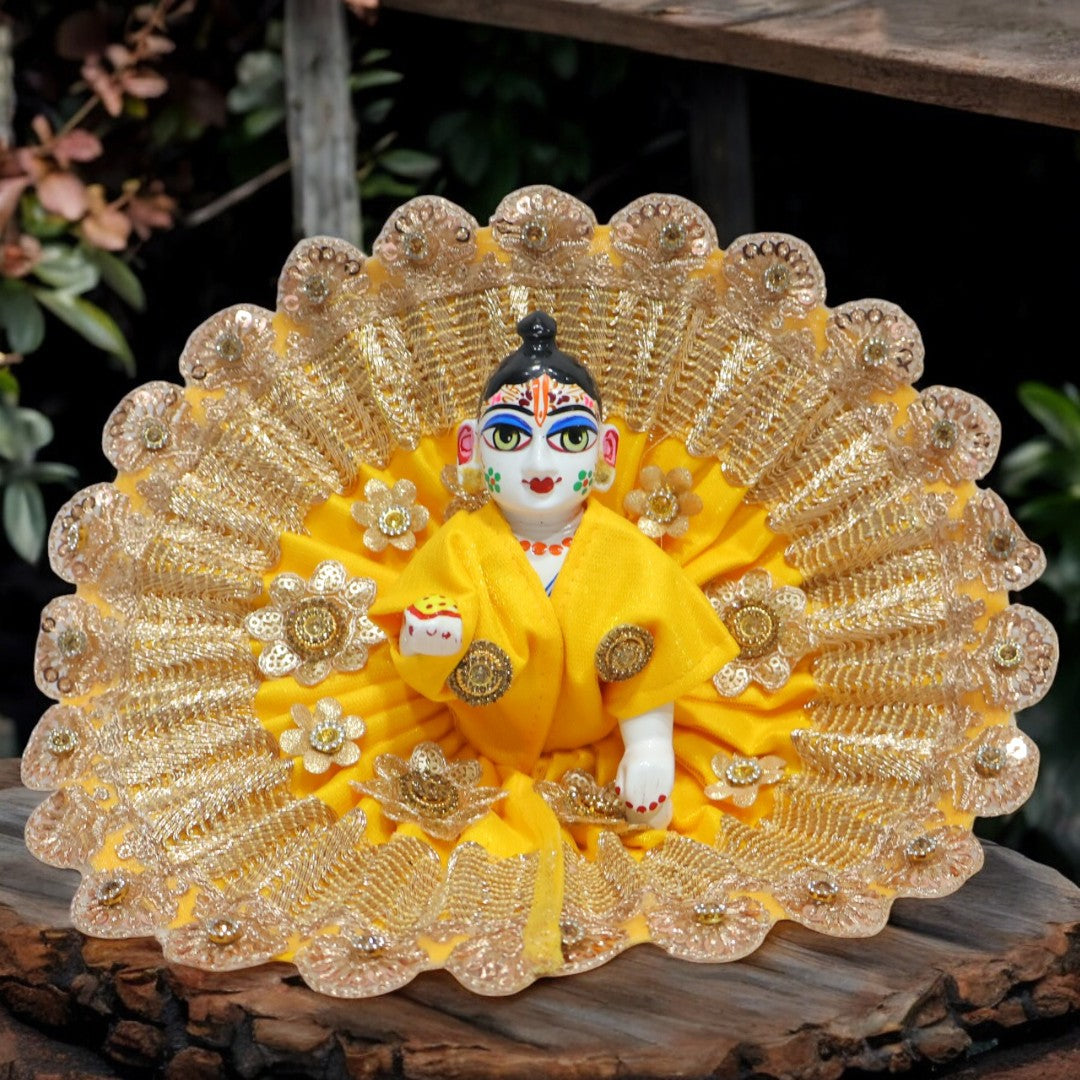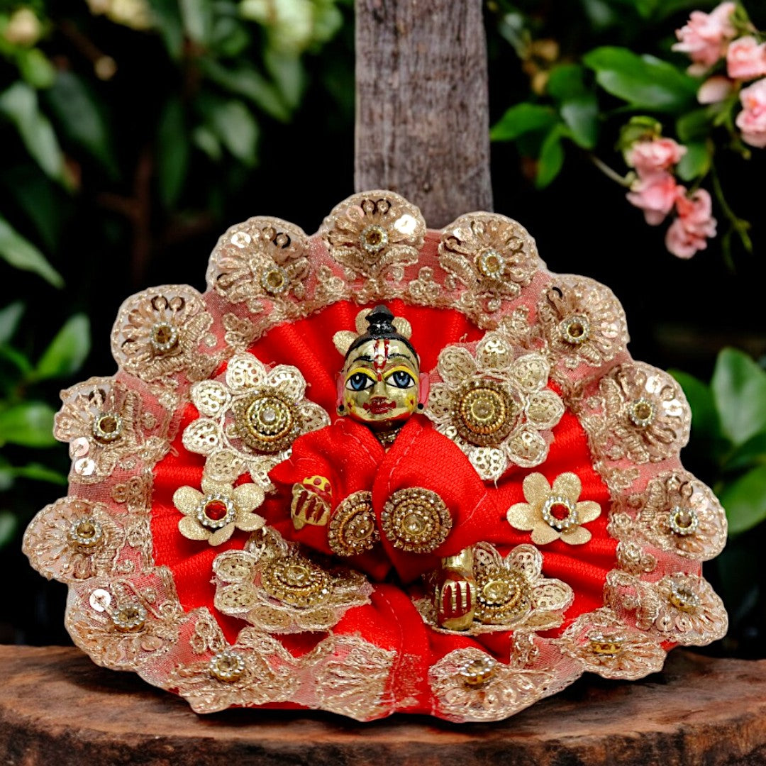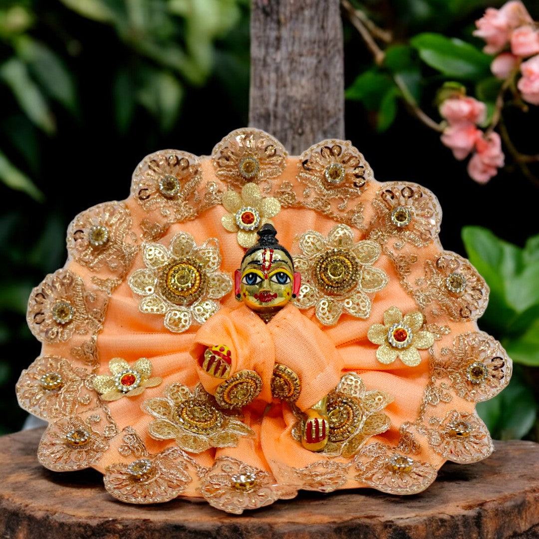 Dress your Laddu Gopal Ji in this exquisite Laddu Gopal Ji Poshak from Shri Poshak, crafted with premium fabrics like silk and cotton. It features intricate embroidery, vibrant colors, and delicate detailing, perfect for adorning your idol during daily worship or special occasions like Janmashtami, Diwali, and more.