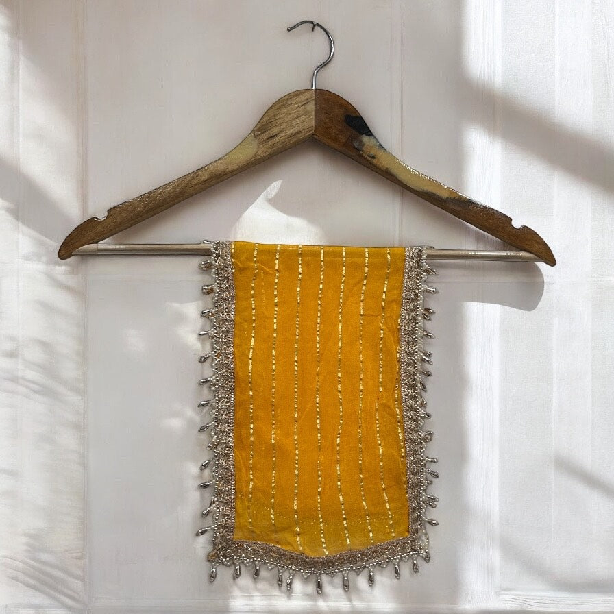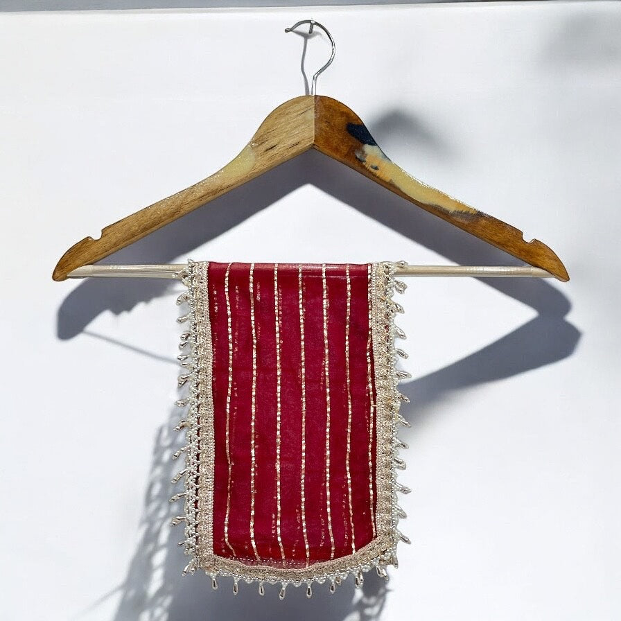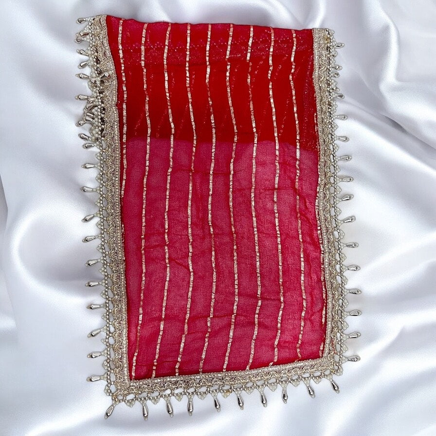 Elevate your pooja rituals with this beautiful handcrafted Mata Rani Chunri, designed to bring divine blessings and positivity to your spiritual space. the intricate golden embroidery and luxurious pearl-beaded border add a touch of elegance and grandeur.