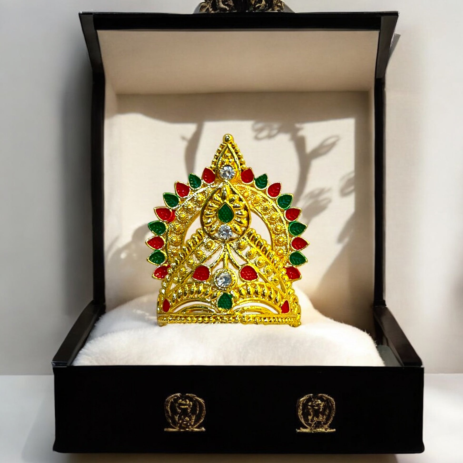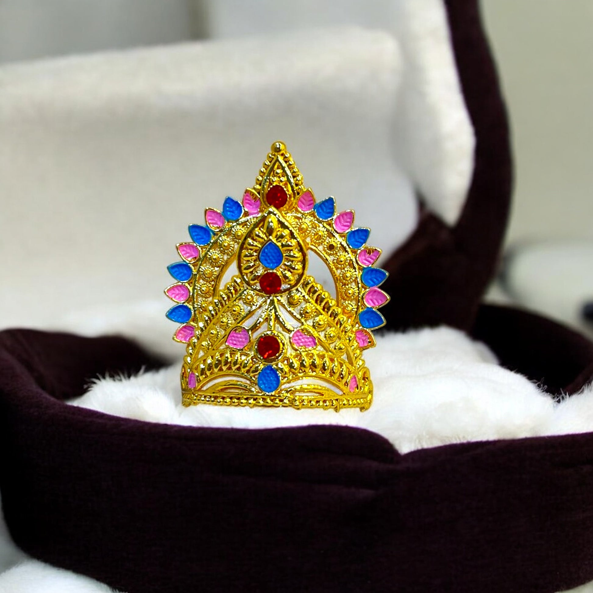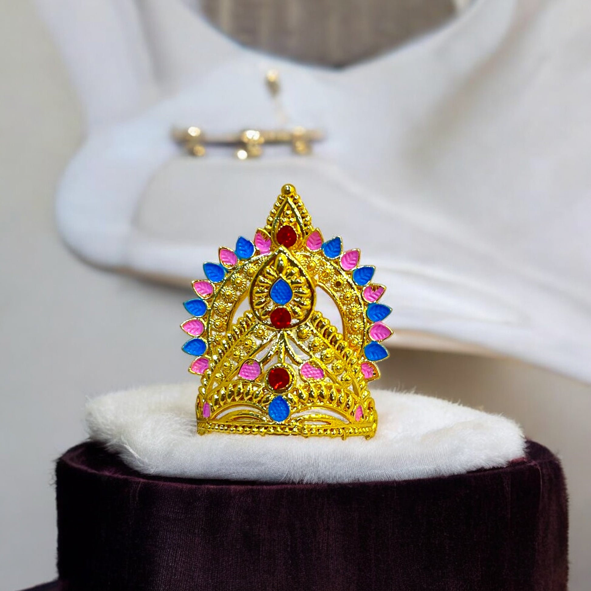 Bring divine elegance to your Laddu Gopal Ji's roop with this exquisitely crafted golden Mukut, a perfect blend of tradition and artistry. Designed with intricate detailing, sparkling green stones, and a vibrant red centerpiece, this crown adds a majestic aura to your deityβs appearance.