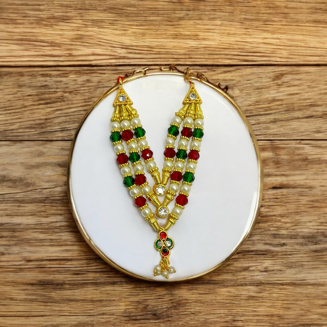 Adorn your beloved Thakurji with this exquisitely handcrafted Shringar Mala, a blend of traditional design and festive charm. Featuring three elegant layers of white pearls, rich red and green beads, and radiant kundan-style stones, this mala is a perfect offering of love, devotion, and beauty.