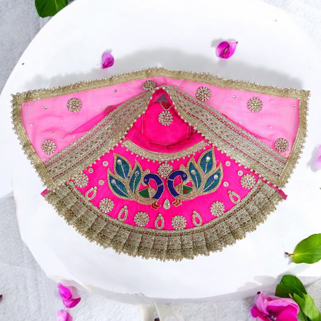 Every detail is highlighted with sparkling embellishments and rich handwork, making it a perfect attire for Mata Rani’s divine shringar. The premium craftsmanship ensures both beauty and devotion are woven together in this exclusive design.
