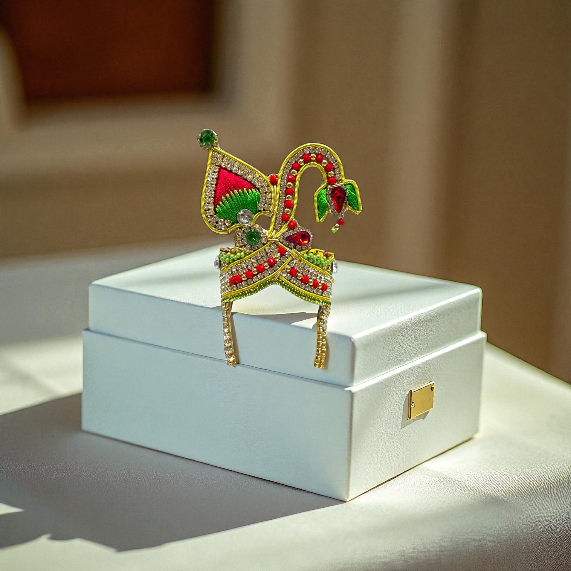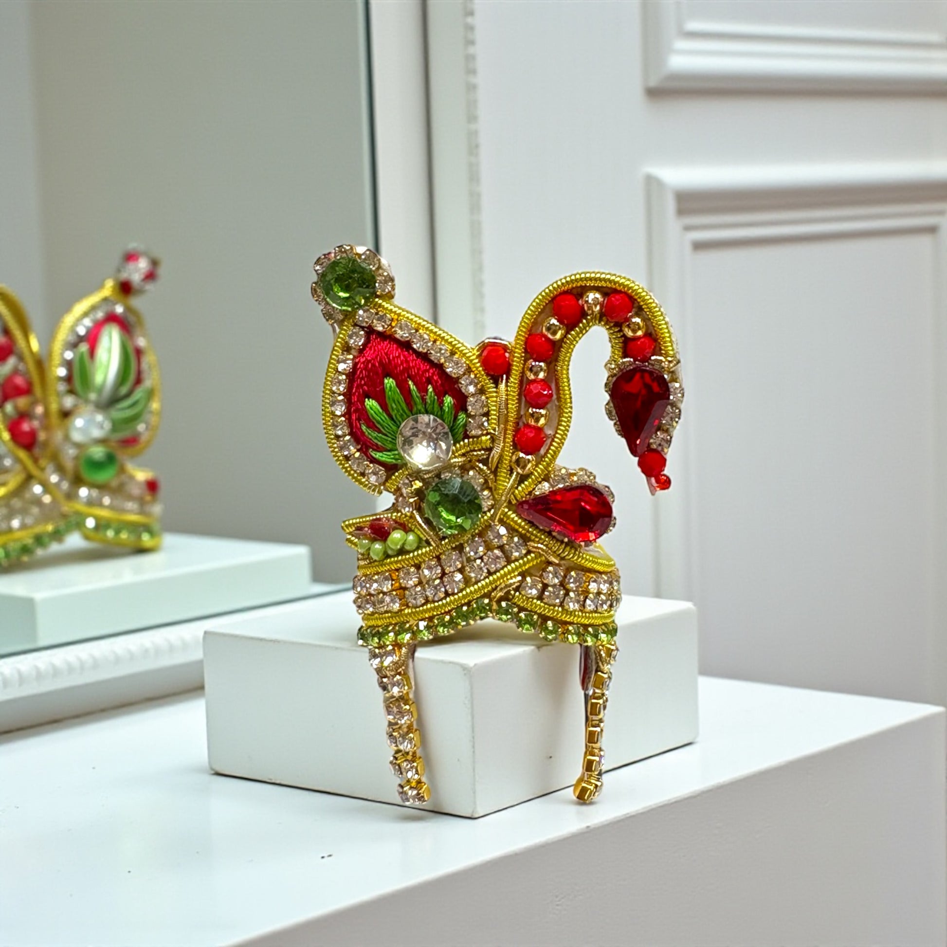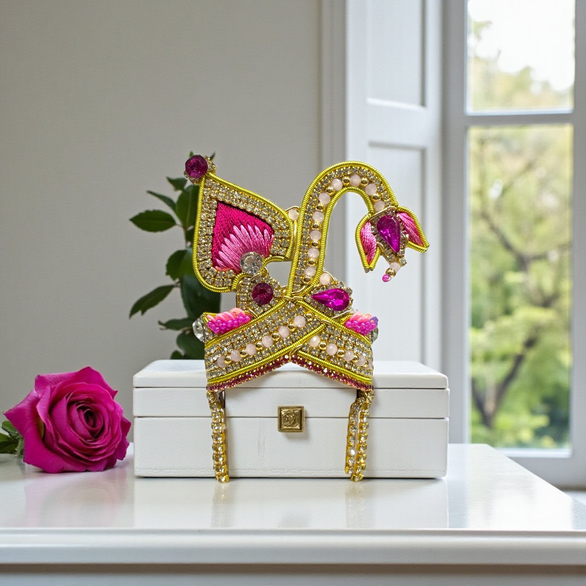 Adorn your beloved deity with this stunning Jardogi Mukut from Shri Poshak. Featuring elaborate, traditional Zardozi embroidery—a luxurious craft involving metallic threads, beads, and stones—this crown is a perfect way to enhance your daily Shringar or festive worship.