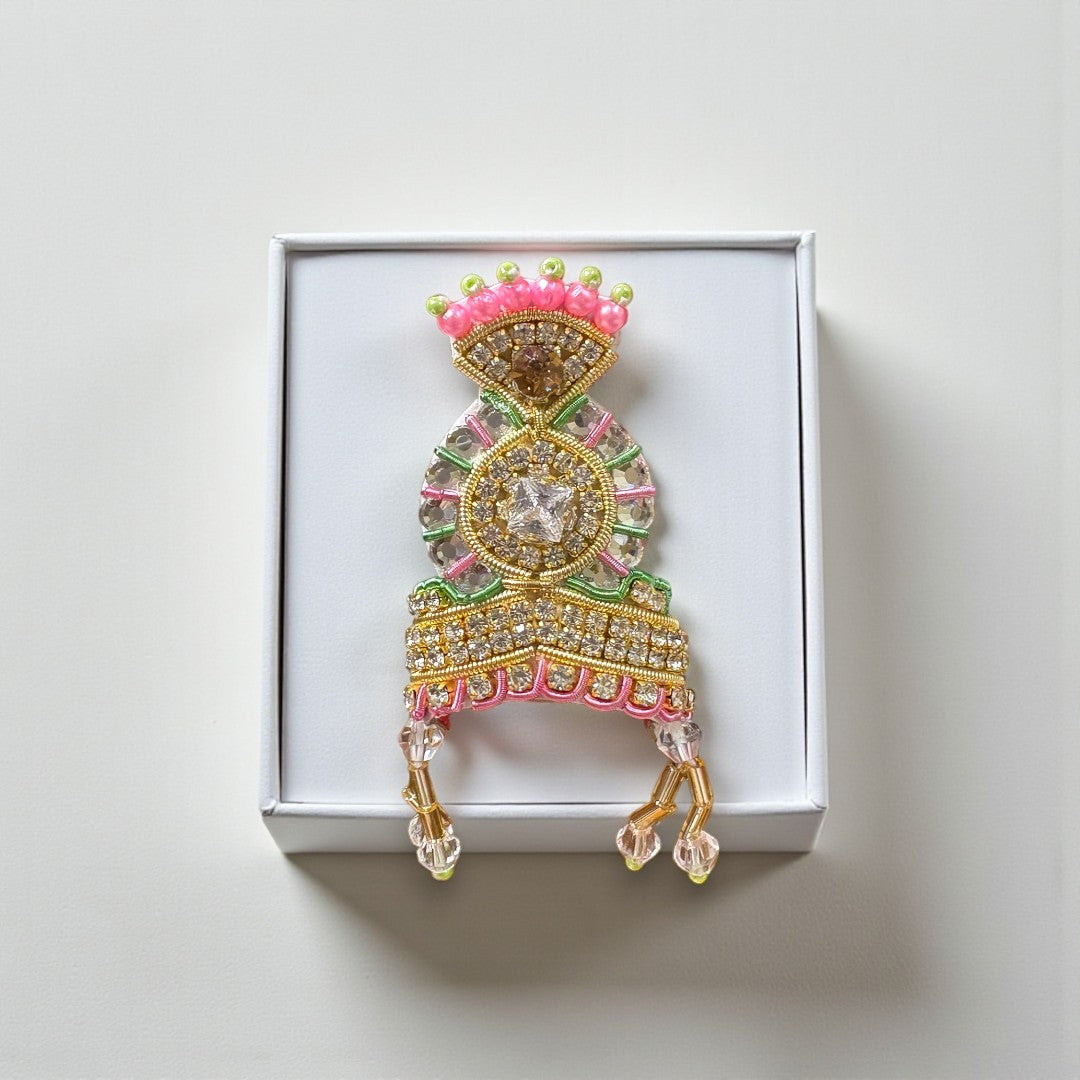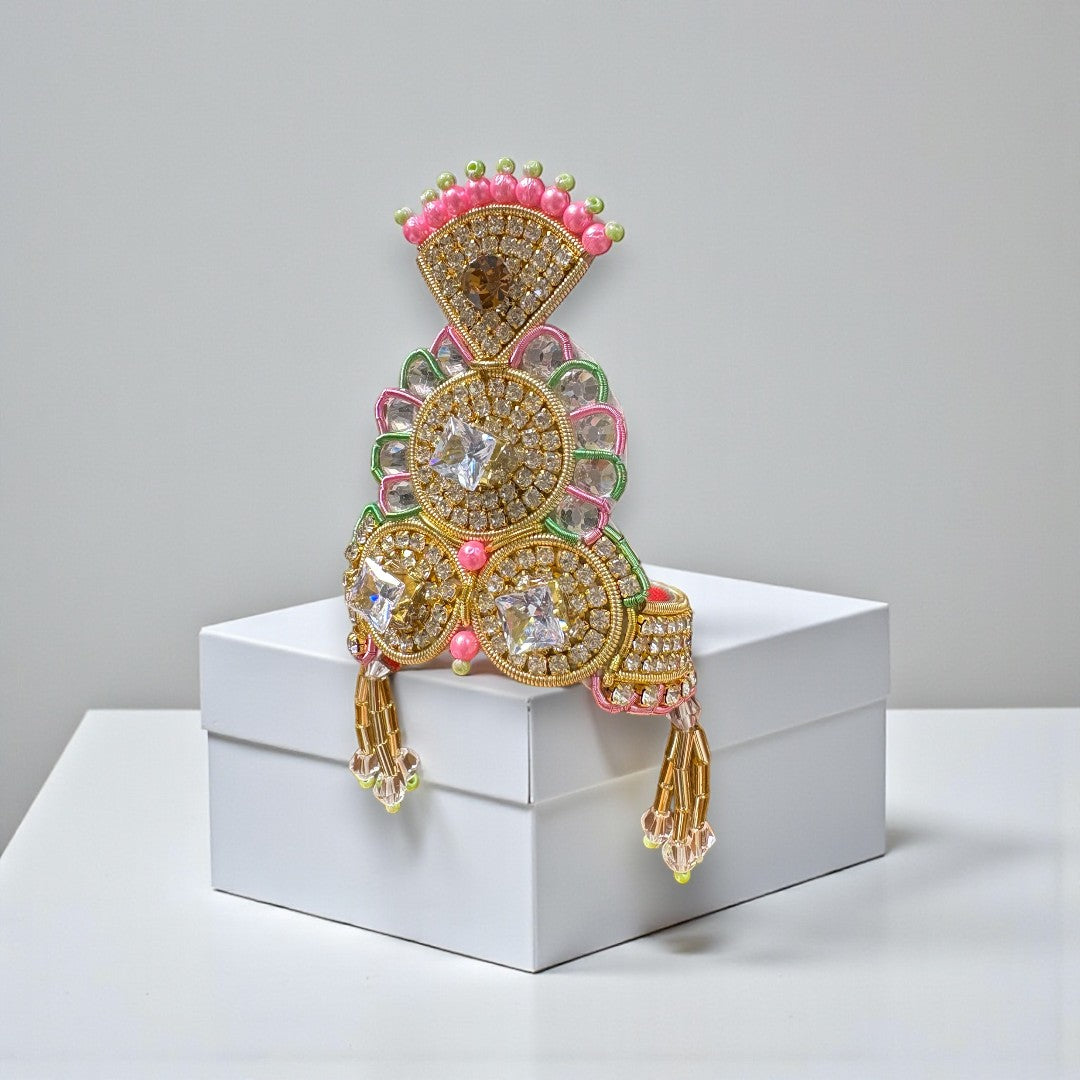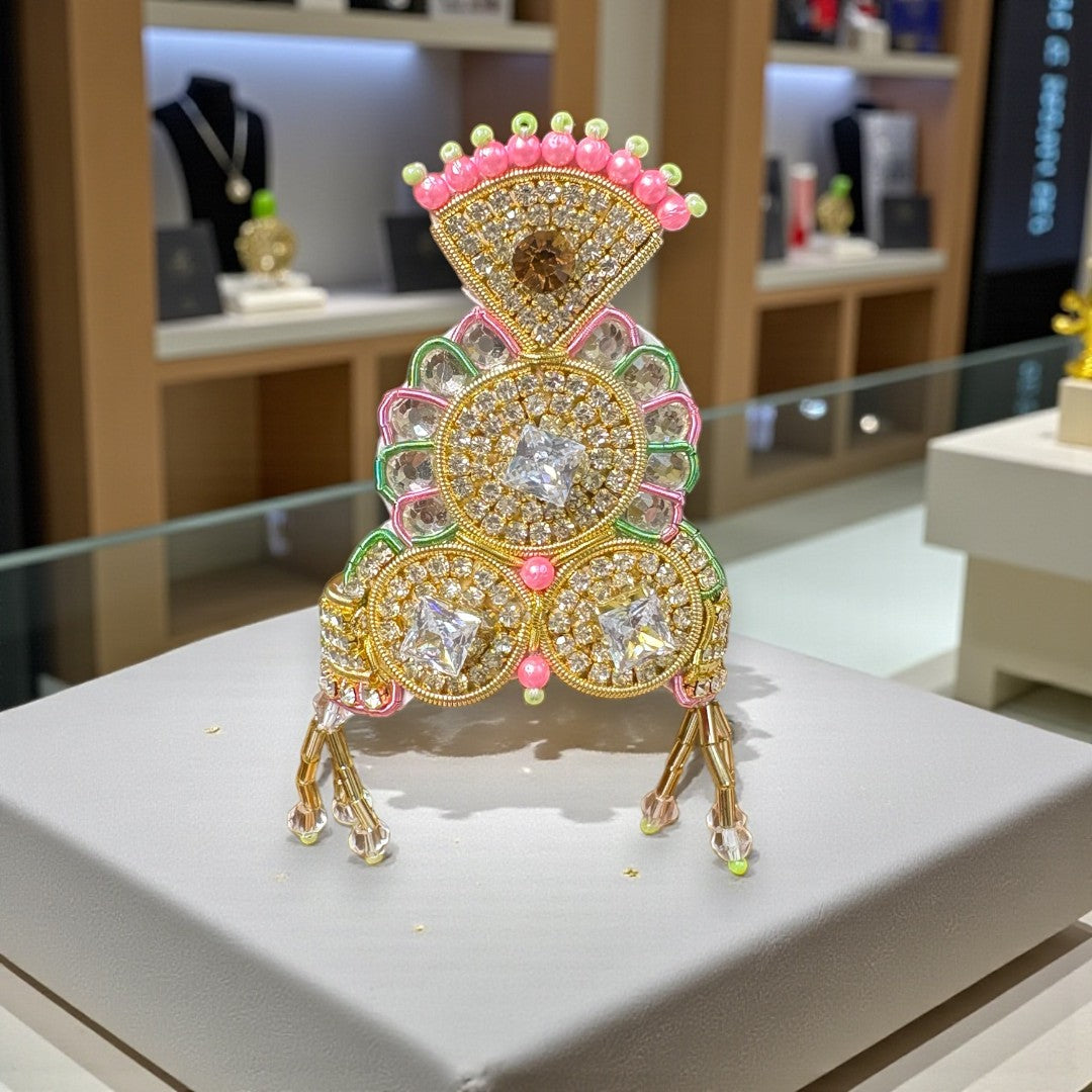 Celebrate the joy of devotion with the Shri Poshak SP-No. 097. This premium mukut is distinguished by its unique three-tiered circular architecture and candy-toned accents. Hand-crafted to perfection, it brings a bright, celebratory energy to your deity’s Shringar, making every Darshan feel like a grand festival.