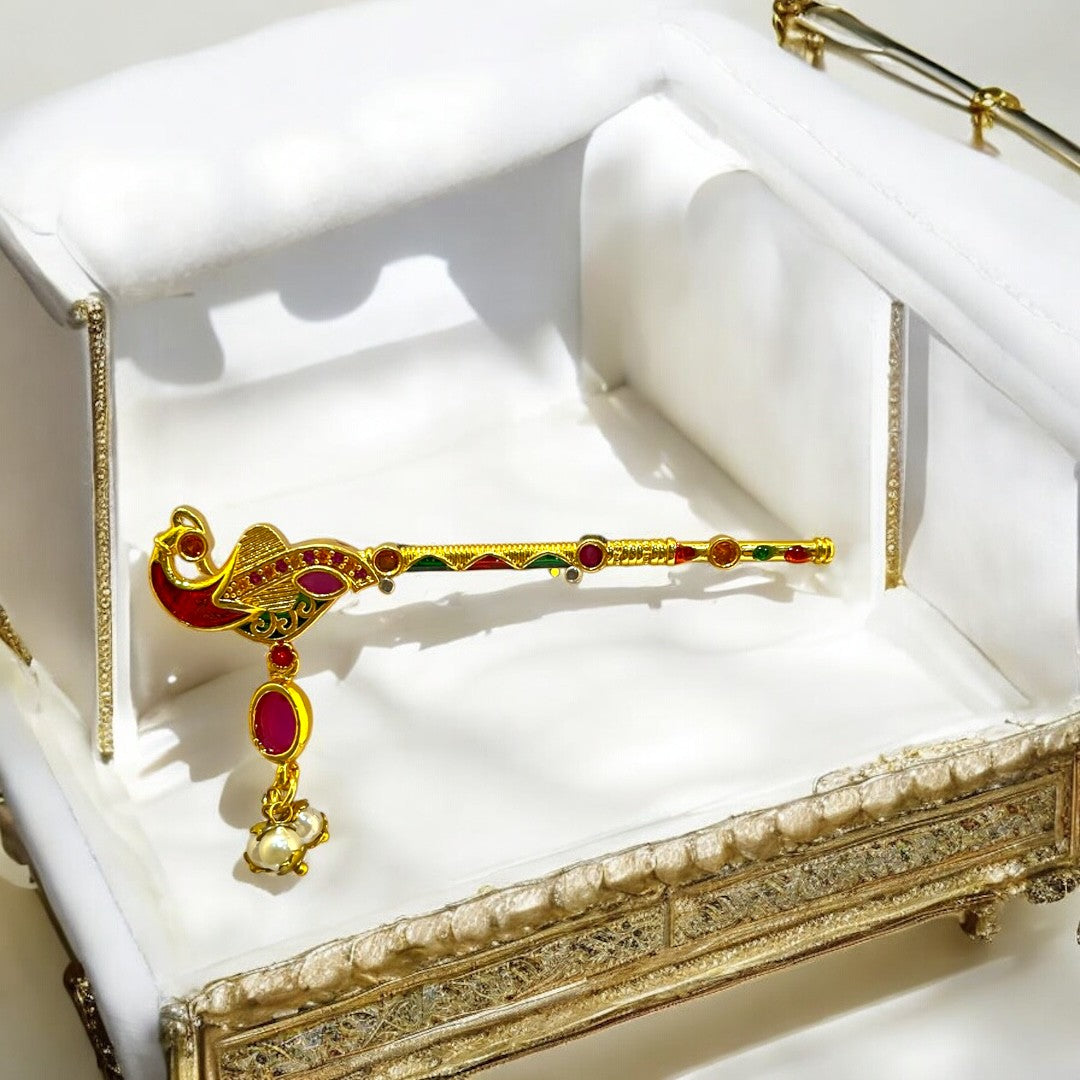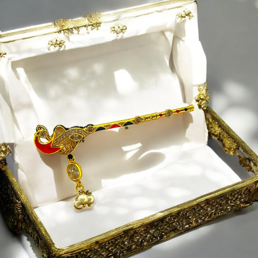 Make your Thakurji’s shringar truly divine with this Premium Peacock Bansi (SPC-426), crafted from fine metal and exquisitely decorated with brilliant American Diamonds. The intricately designed peacock motif adds a graceful, spiritual charm, while the shimmering stones elevate the look with a royal finish.