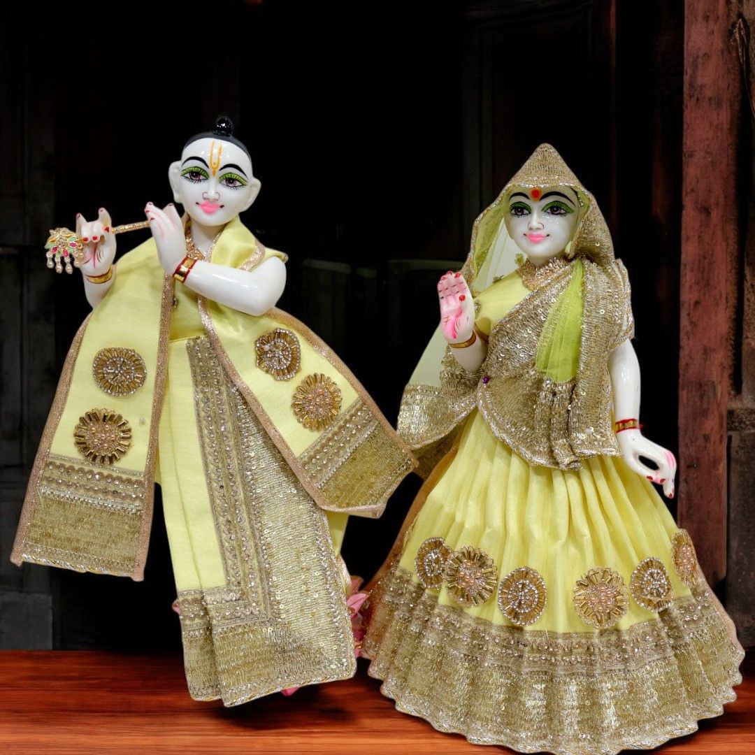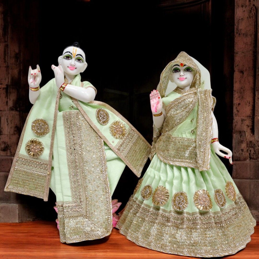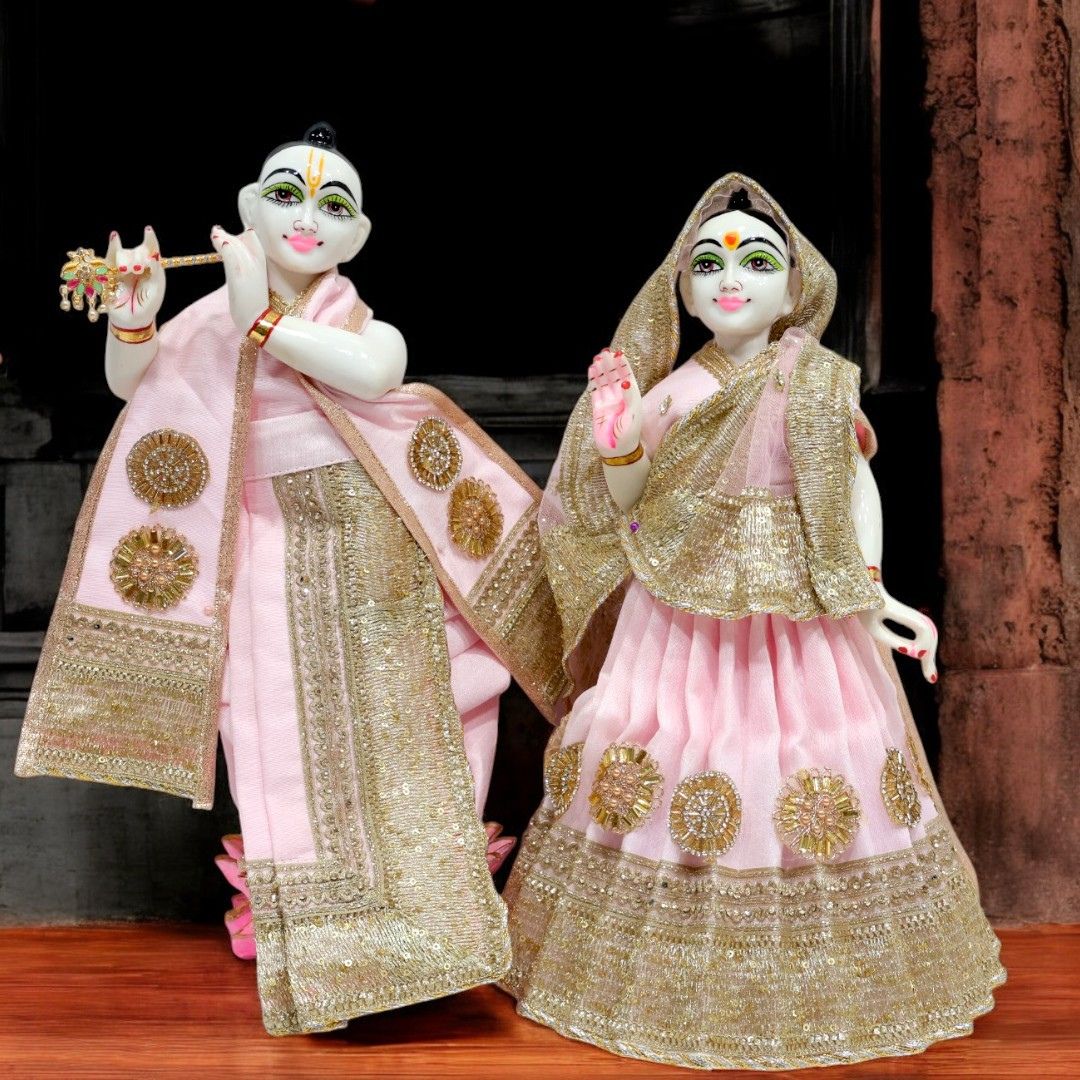 Elevate your deity's divine aura with this stunning Radha Krishna outfit, only at Shri Poshak – where tradition meets devotion.