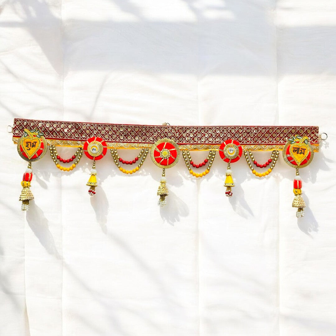 Celebrate auspicious beginnings with our Shubh Labh Red-Golden Beaded Toran, a perfect blend of devotion, tradition, and artistry. Handcrafted with intricate beadwork, vibrant red-yellow detailing, and elegant golden danglers, this toran beautifully enhances your entrance, making it welcoming and festive. The Shubh–Labh symbols at both ends bring blessings of prosperity, positivity, and happiness into your home.