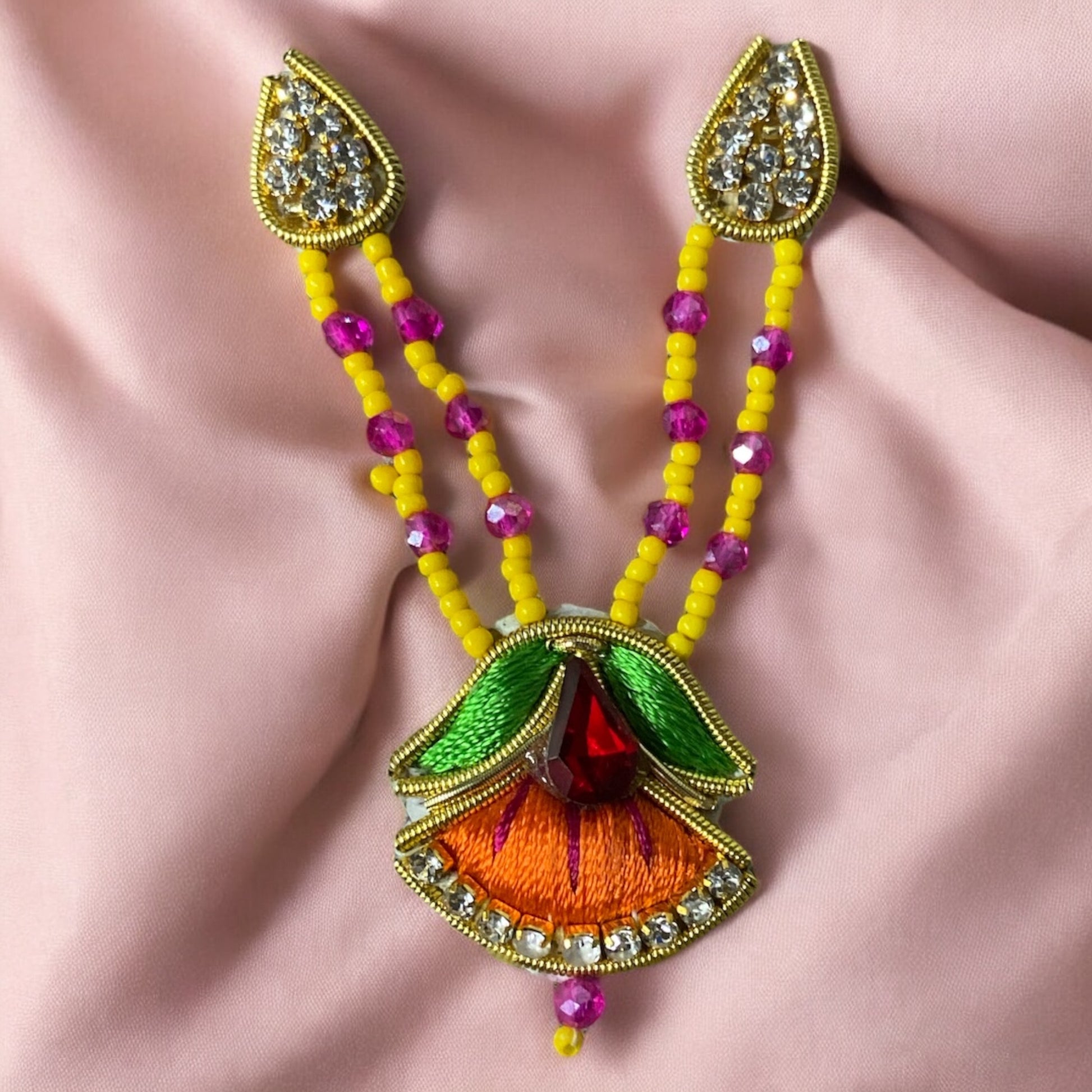 Add divine charm and elegance to your beloved deity's attire with this exquisite multicolor designer mukut mala set. Crafted with intricate embroidery, vibrant hues, and sparkling stones, this set is a perfect blend of tradition and modern craftsmanship.