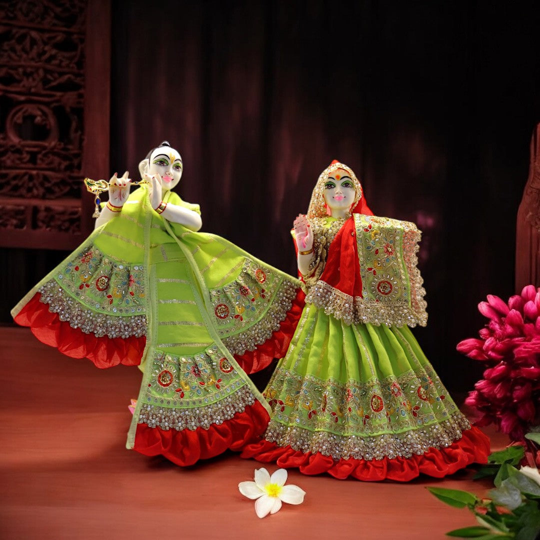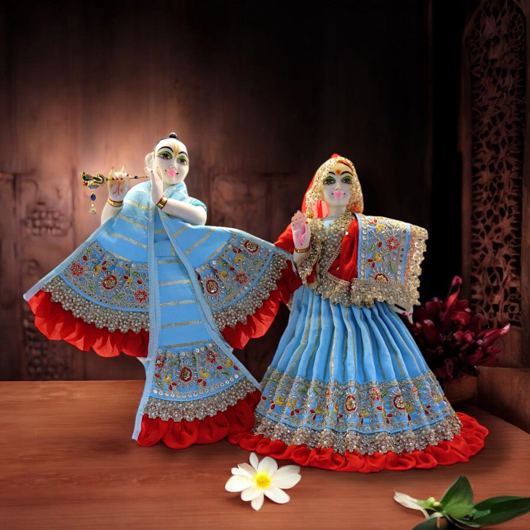 Adorn your divine Radha Krishna with this exquisitely crafted poshak set, designed to reflect devotion, royalty, and traditional artistry. Featuring finely pleated fabric and beautifully embellished borders, this poshak brings a divine aura to your deity’s appearance.
