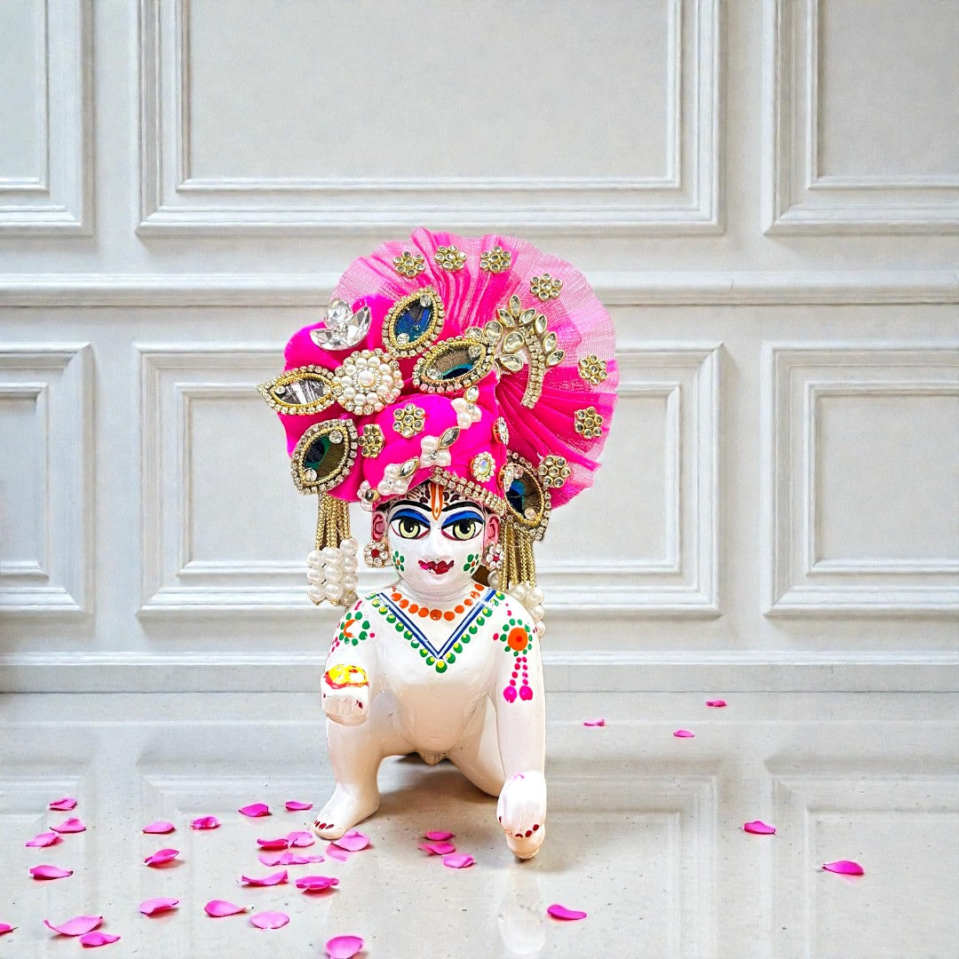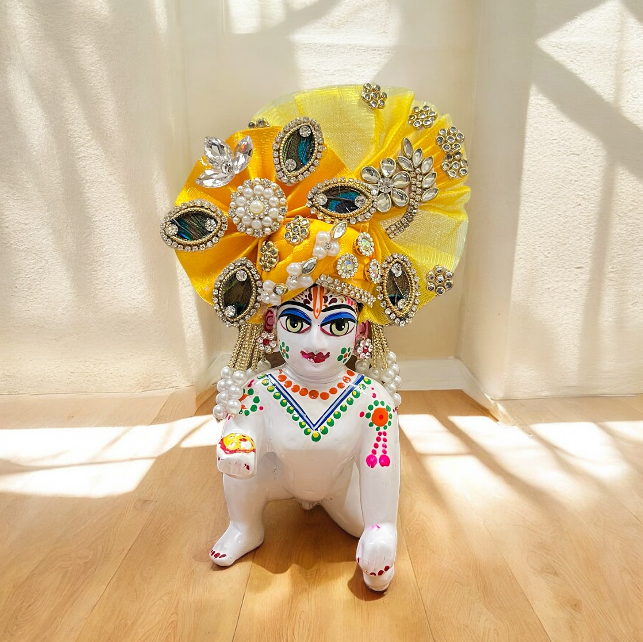Elevate your Ladoo Gopal ji’s Shringar with the breathtaking SP-H100 Designer Pagree. This headgear is a masterpiece of intricate detailing, designed to bring a royal and majestic aura to your deity.