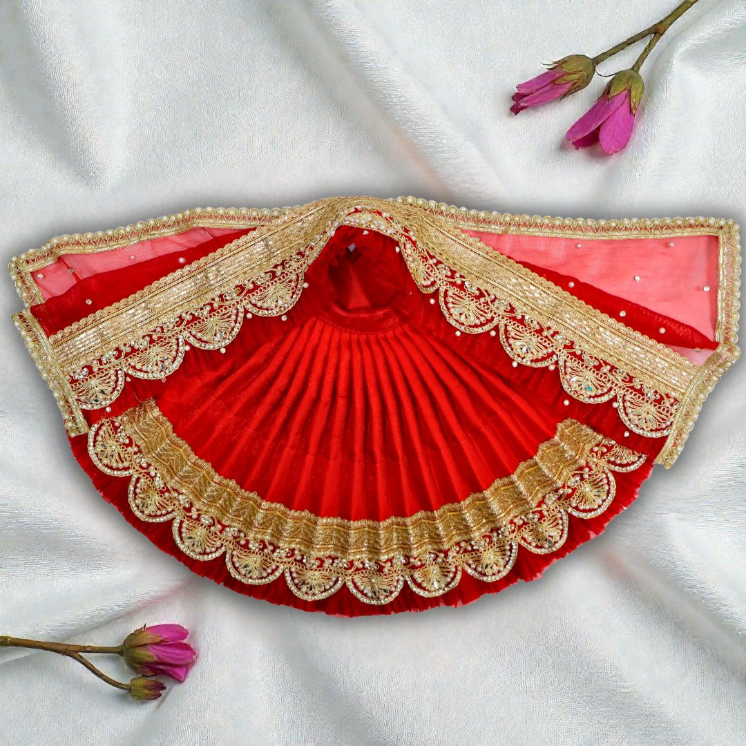 Pearl-Studded Chunri: The delicate net dupatta is hand-embellished with tiny white pearls, mimicking a star-studded sky, adding a soft elegance to the fierce deity.