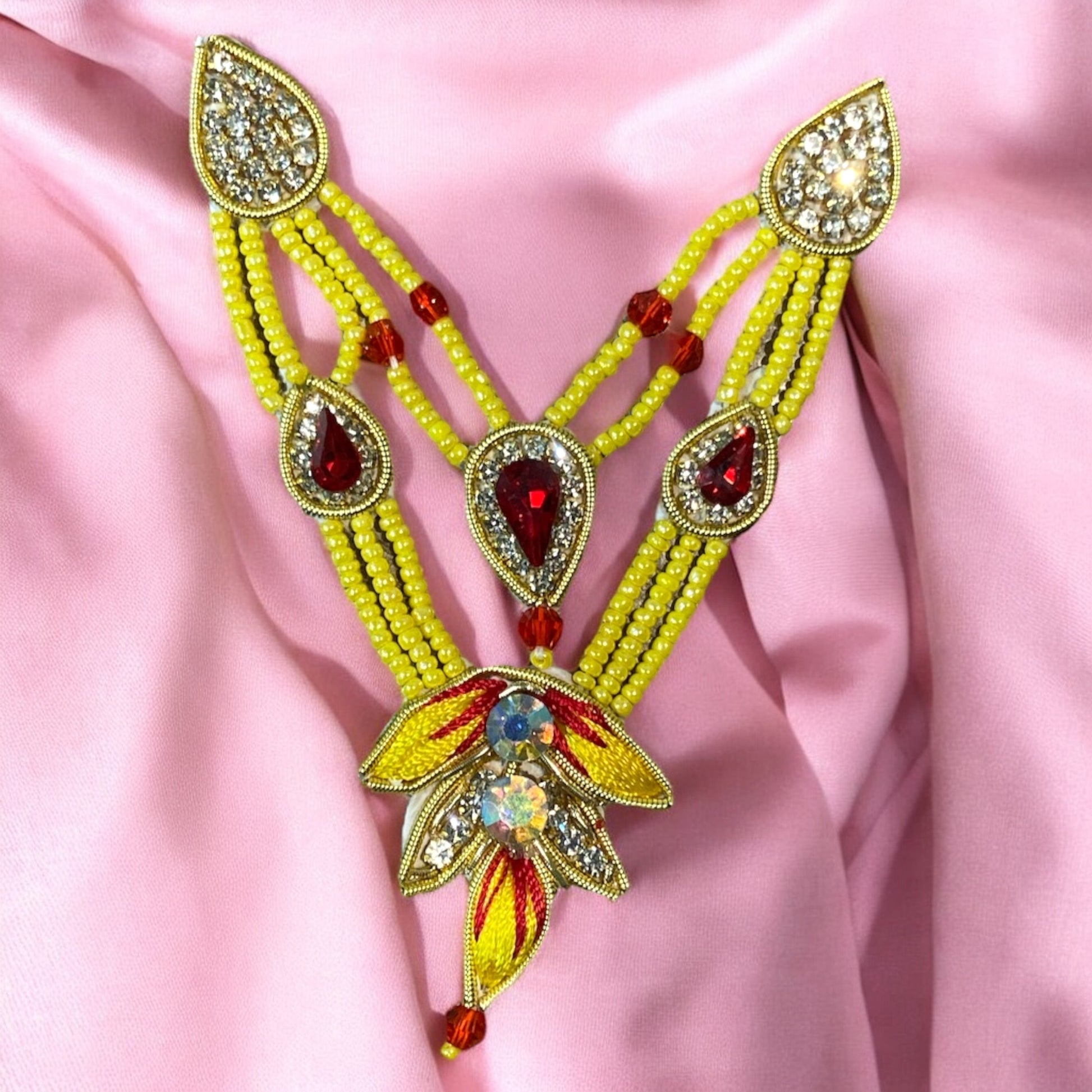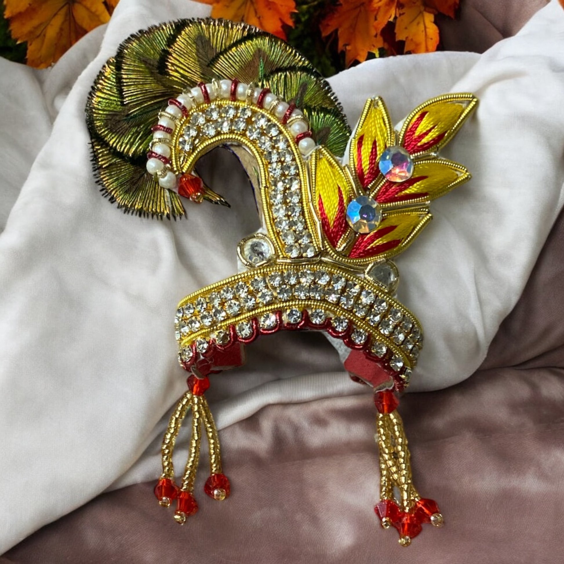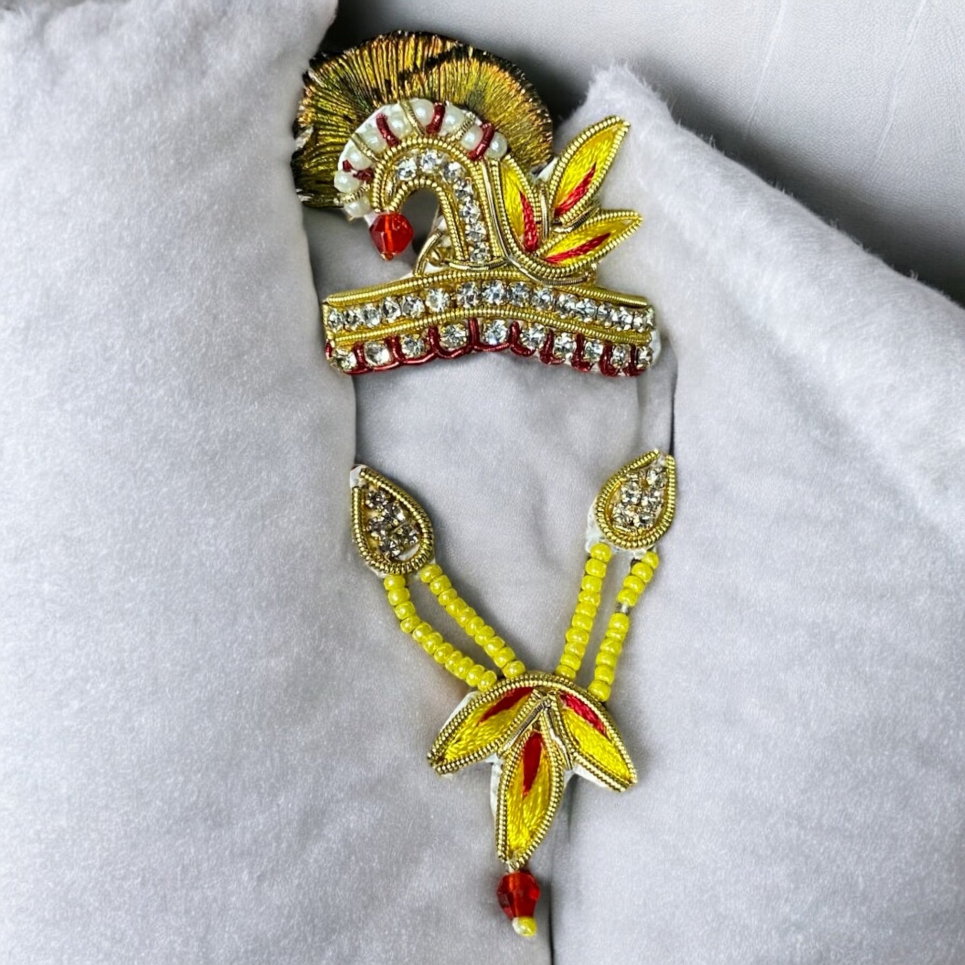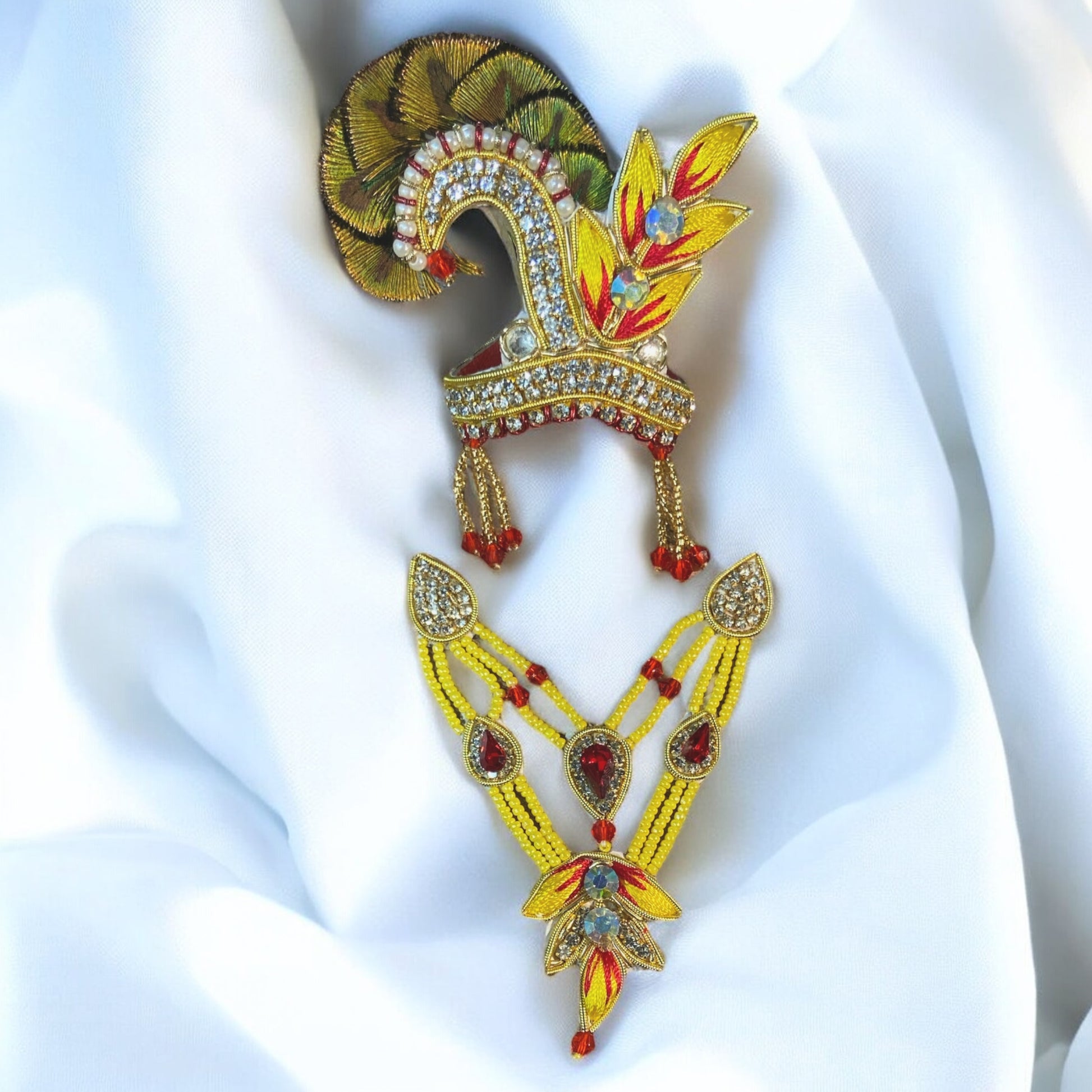- Elegant Design: Includes a stunning Mukut (crown) in golden hues with red and yellow accents, paired with a beautifully matching mala.