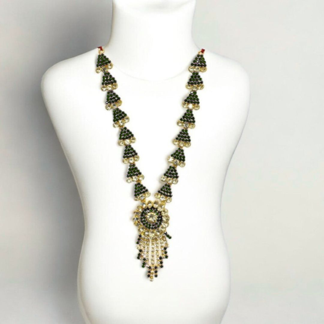 Premium SPC-379 Emerald & Diamond Zerkin Haar | Exquisite Long Necklace for All Deity Idols (Ladoo Gopal, Radha Krishna, Devi Maa)