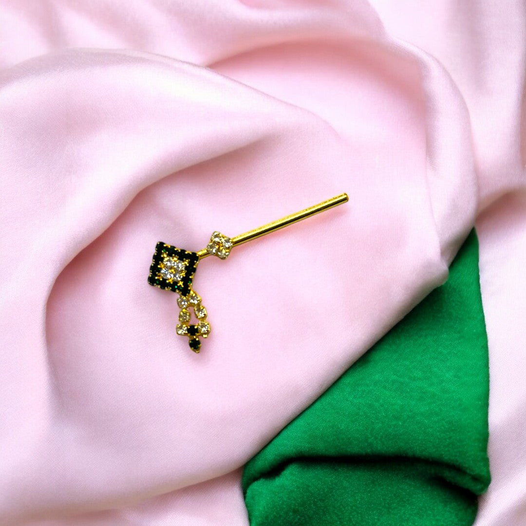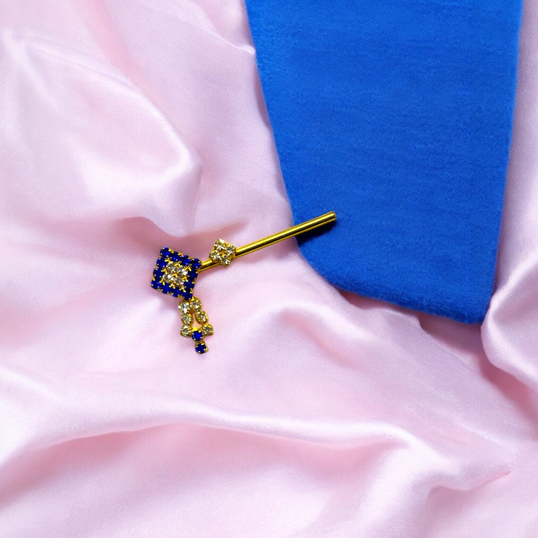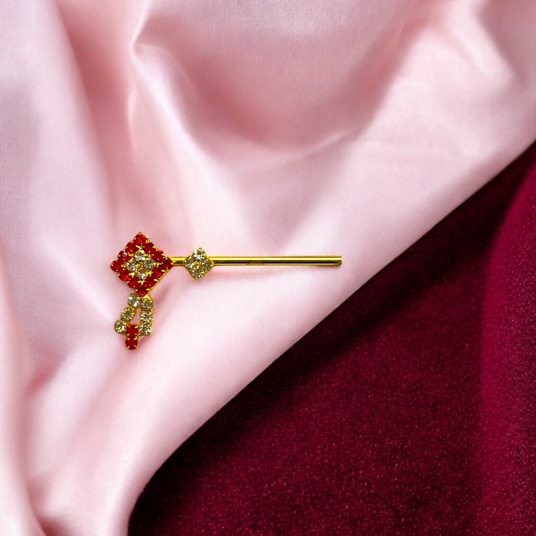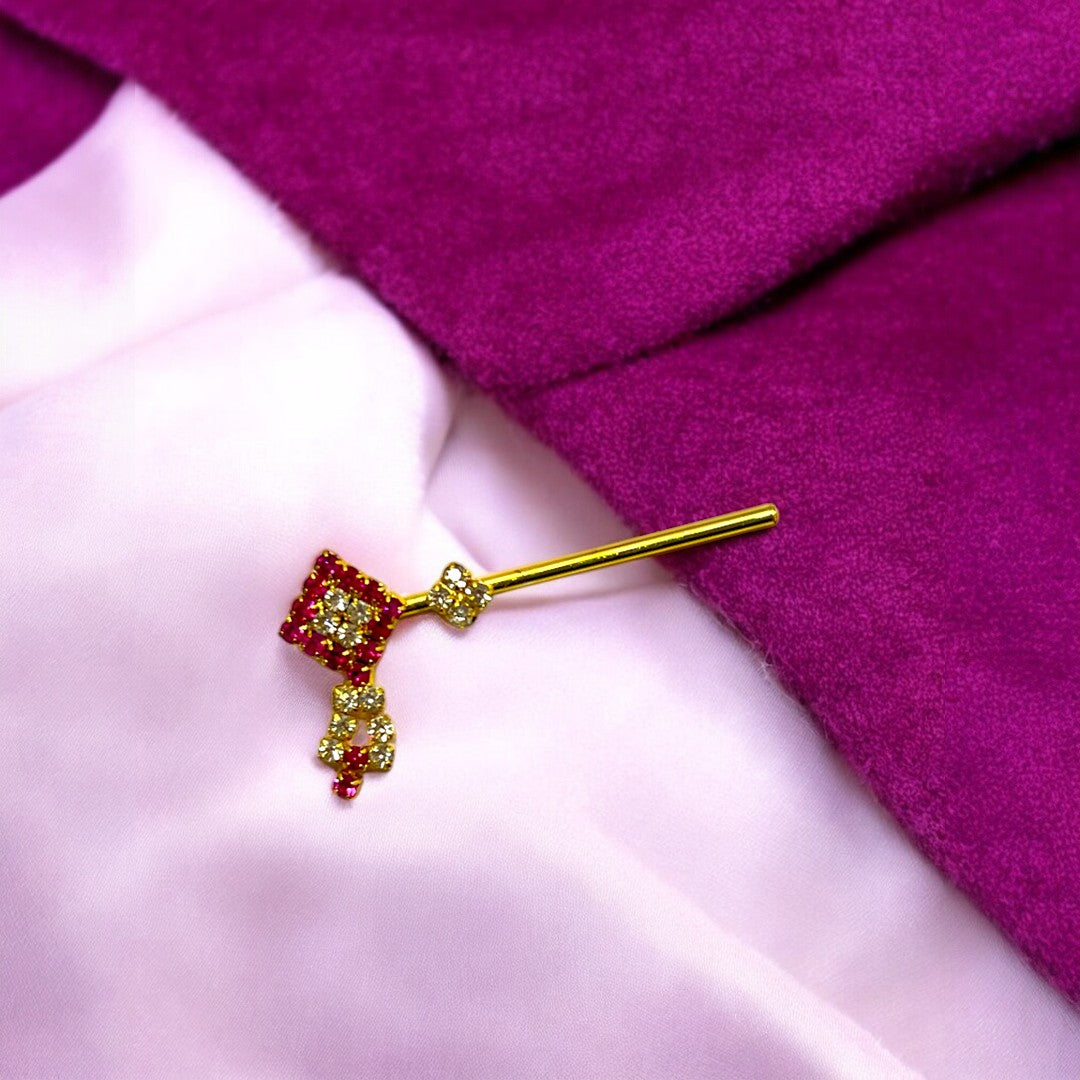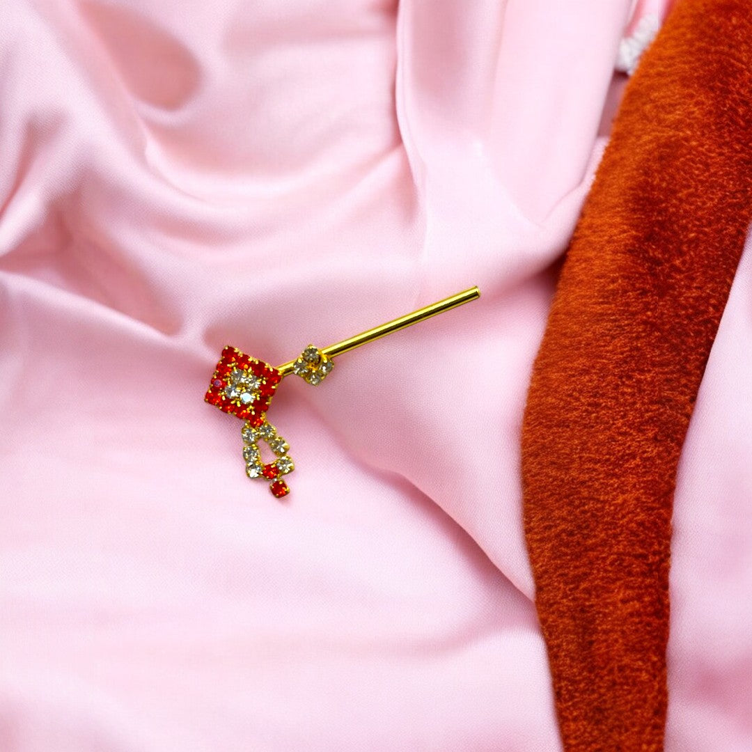 Adorn your Thakur Ji with this exquisite handcrafted Bansi, designed to reflect the playful and divine charm of Lord Krishna. Featuring elegant red and green thread detailing, a glossy golden finish, and a vibrant red droplet charm, this Bansi adds a festive and devotional touch to your deity’s look. The intricate peacock-inspired design on the handle enhances its traditional beauty.