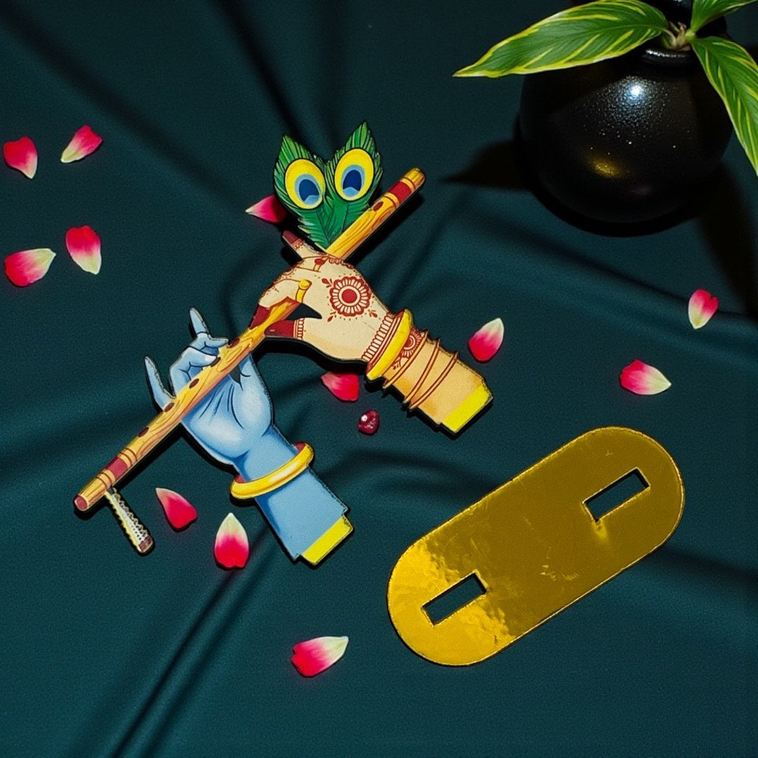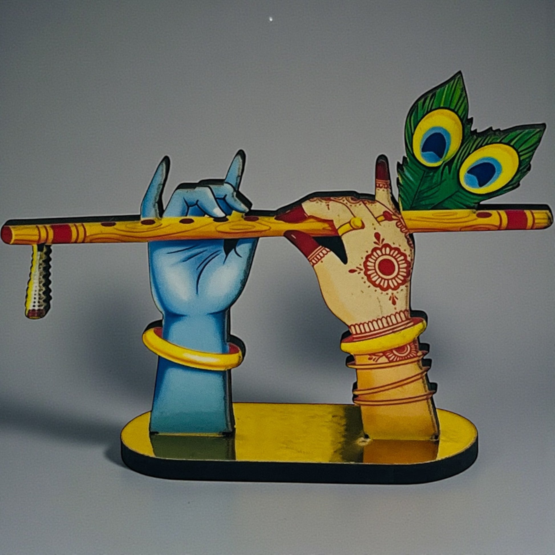 Bring the soulful vibrations of Vrindavan to your personal space with our 3-inch Radha Krishna MDF Table Stand. This masterfully designed self-standing piece captures the essence of the Divine Couple’s harmony, depicted through their sacred hands holding the flute adorned with a vibrant peacock feather.